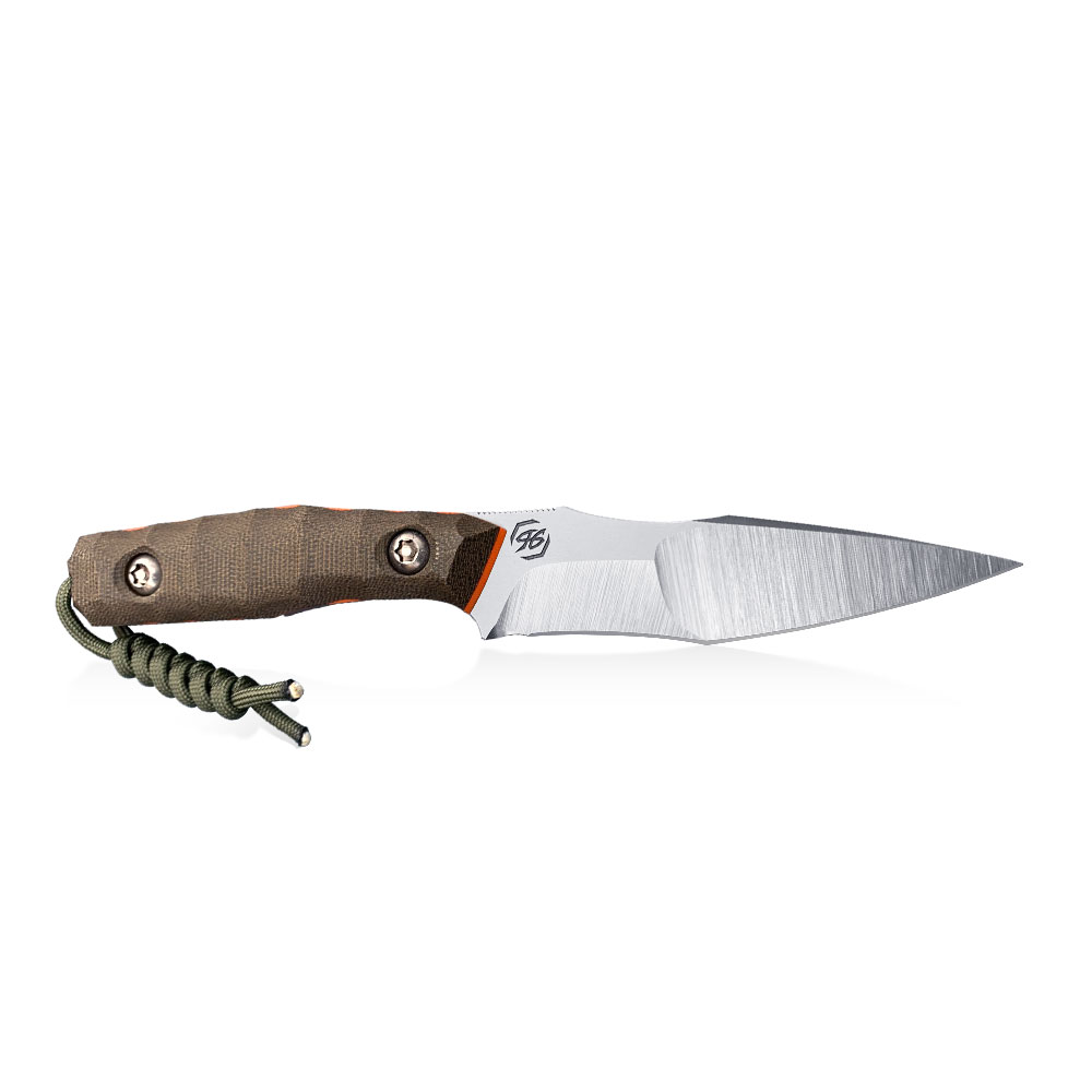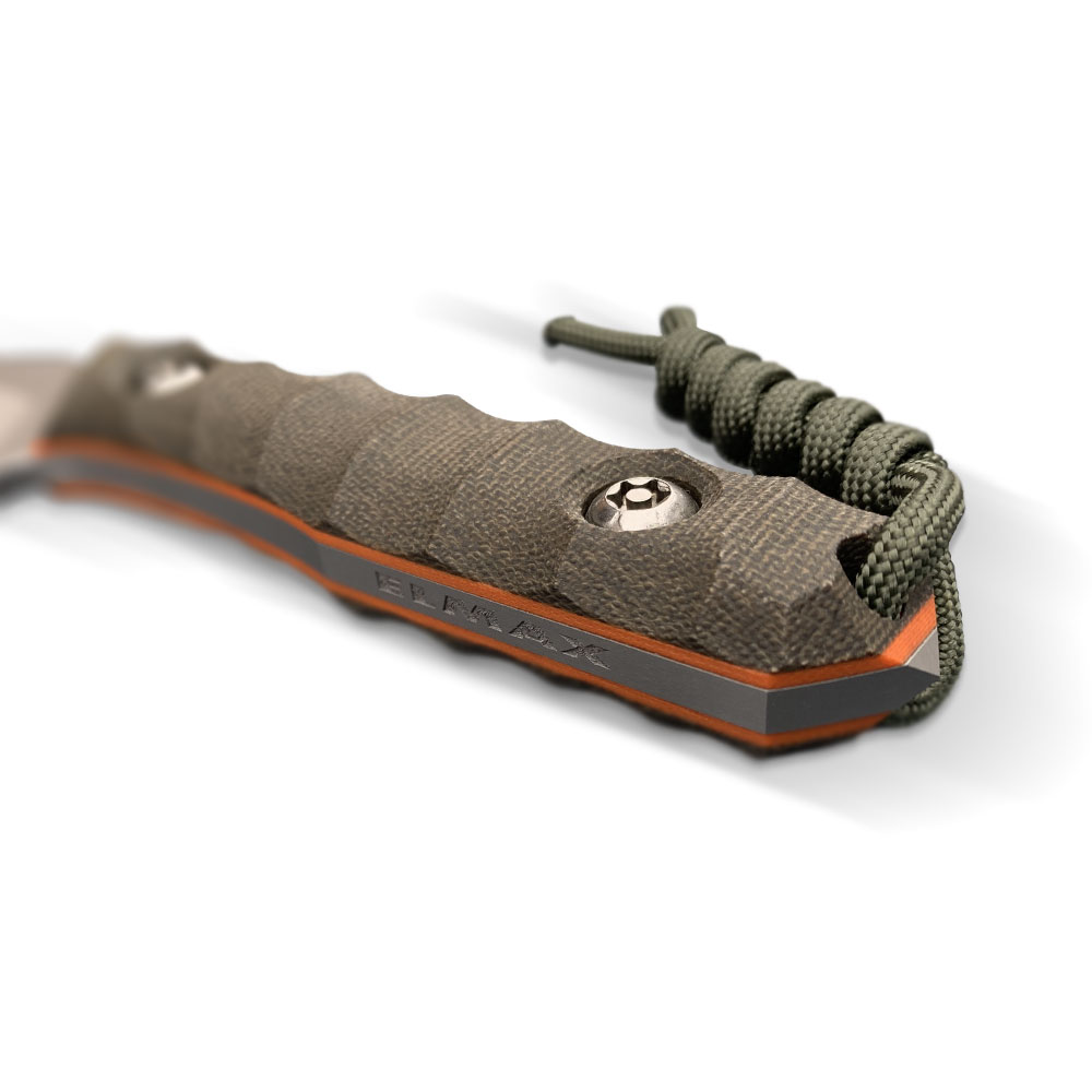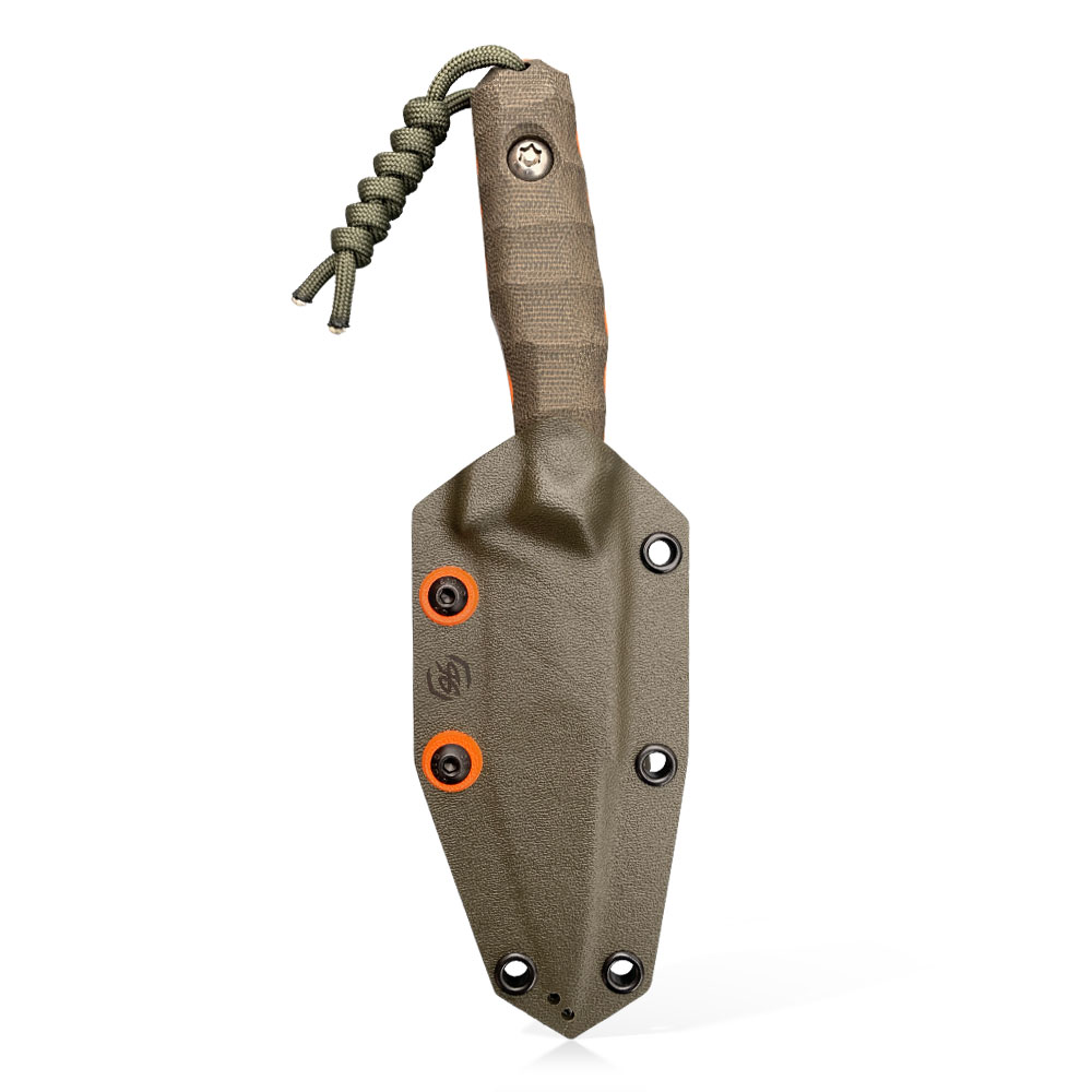 Okładziny rękojeści o ergonomicznym kształcie wykonane zostały z zielonej micarty, materiału odpornego na wilgoć, zmiany temperatury, większość rozpuszczalników i kwasów, posiadającego wysoką odporność na uszkodzenia mechaniczne. Micarta znana ze swoich doskonałych właściwości, również wizualnych (daje się stylizować na naturalny materiał) ma antypoślizgową, chropowatą strukturę. Okładziny zostały przykręcone śrubami spójnymi z ogólnym designem noża. Okładziny posiadają profilowania zapewniające pewność chwytu, niezależnie od tego, czy pracujemy w czy bez rękawiczki . Na zakończeniu rękojeści zaprojektowano wybijak do szyb, w którym znajdziemy otwór na na paracord. Oryginalnie zapleciono w nim odcinek paracordu, który poprawia chwytność całości i ułatwia wyjmowanie noża z kabury.