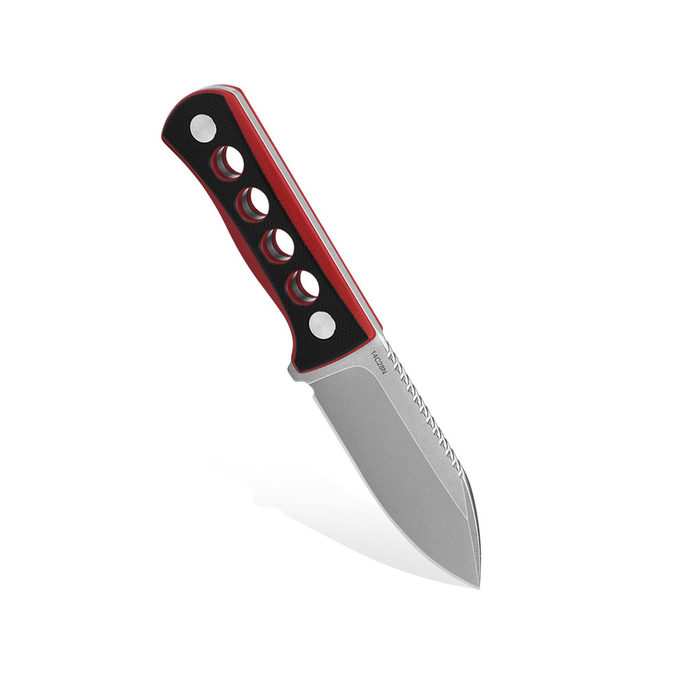 Nóż QSP Knife Canary QS141-B1 14C28N Black/Red G10 posiada głownie typu spear point ze szlifem płaskim i wykończeniem stonewash, wykonaną ze stali 14C28N oraz okładki z czarno-czerwonego kompozytu G10. Rękojeść została nawiercona dla lepszego wyważenia noża i lepszej trakcji podczas chwytu.
