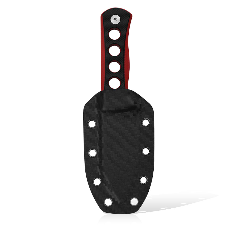 Rękojeść noża wykonana została z czarnego-czerwonego kompozytu G10 i przytwierdzona do stalowej konstrukcji za pomocą śrub. Posiada ona ergonomiczny kształt dla komfortowego chwytu. Całość rękojeści została znacząco odchudzona dzięki kilku otworom, tworząc przy tym bardzo atrakcyjny, urozmaicający projekt wzór. U nasady rękojeści znajdziemy niewielkich rozmiarów jelec, zapobiegający zsunięciu się dłoni na krawędź tnącą.