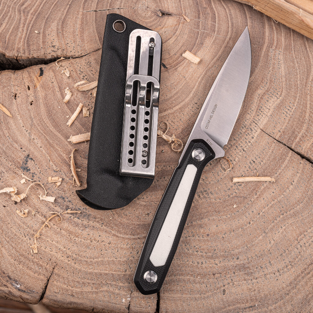Rękojeść dostępna jest w dwóch wersjach — G10 lub micarta — obie zapewniają pewny i wygodny chwyt. Duże, dekoracyjne śruby wzmacniają konstrukcję i nadają całości charakterystyczny styl. Ukryty otwór na linkę zwiększa funkcjonalność noża, a dołączona pochwa z Kydexu z klipsem umożliwia wygodne, bezpieczne przenoszenie.