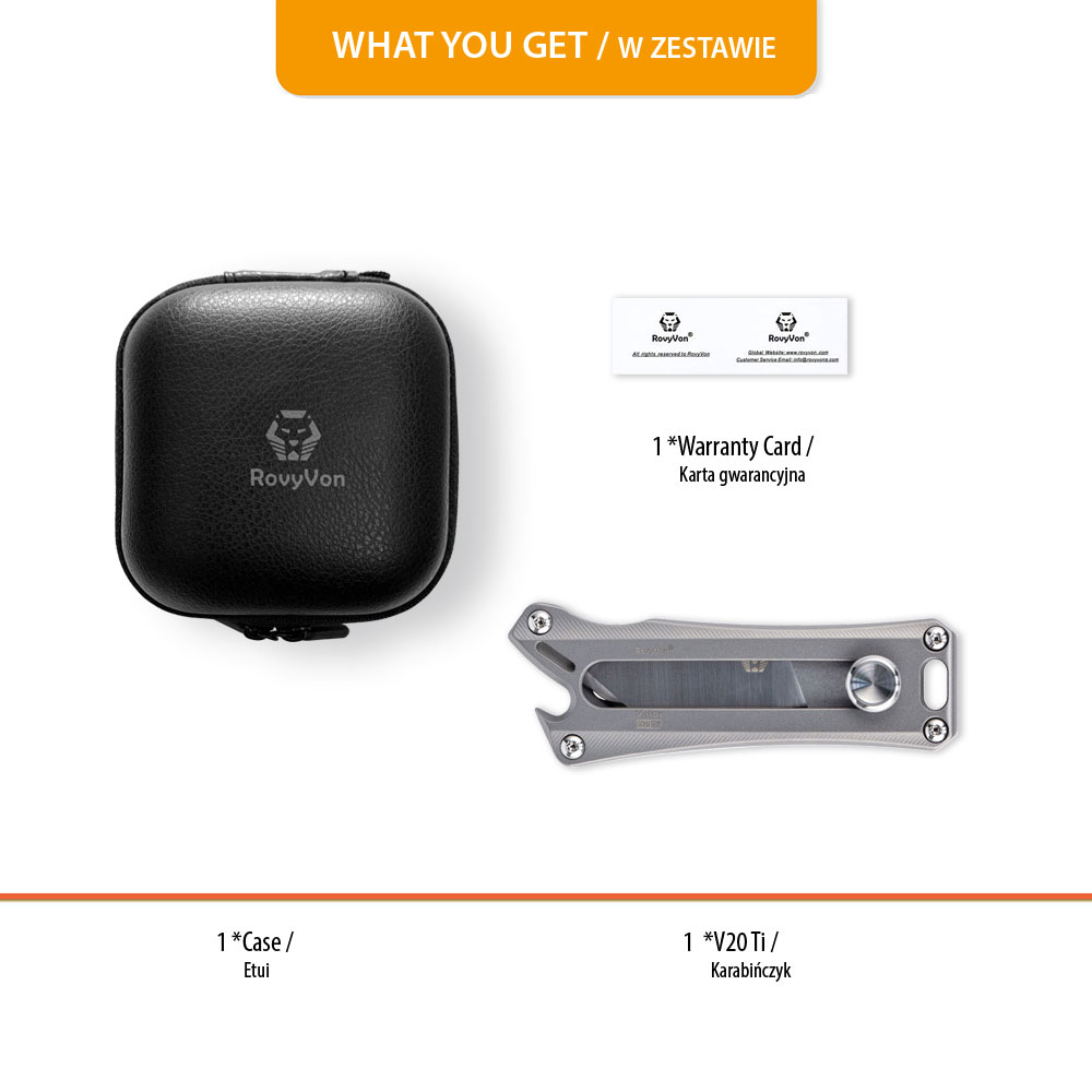 Nóż RovyVon Valor V20 Titanium Utility Pocket Knife | Nóż z Wysuwanym Ostrzem wykonany z tytanu posiada piaskowane wykończenie (sandblasted) i dostarczany jest w poręcznym etui, które stanowi doskonały organizer na akcesoria EDC.