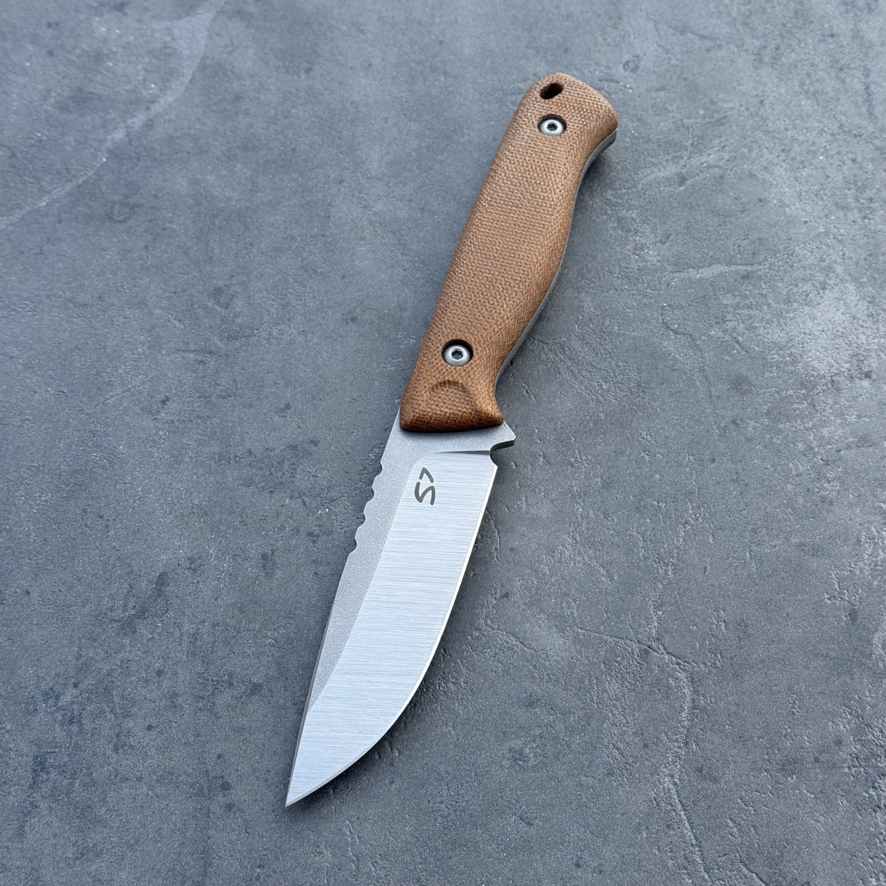 **MATERIAŁ RĘKOJEŚCI**: Okładki rękojeści wykonane zostały z laminatu micarta, materiału odpornego na wilgoć, zmiany temperatury, większość rozpuszczalników i kwasów, posiadającego wysoką odporność na uszkodzenia mechaniczne. Okładki mocowane są na śruby sześciokątne (hex)