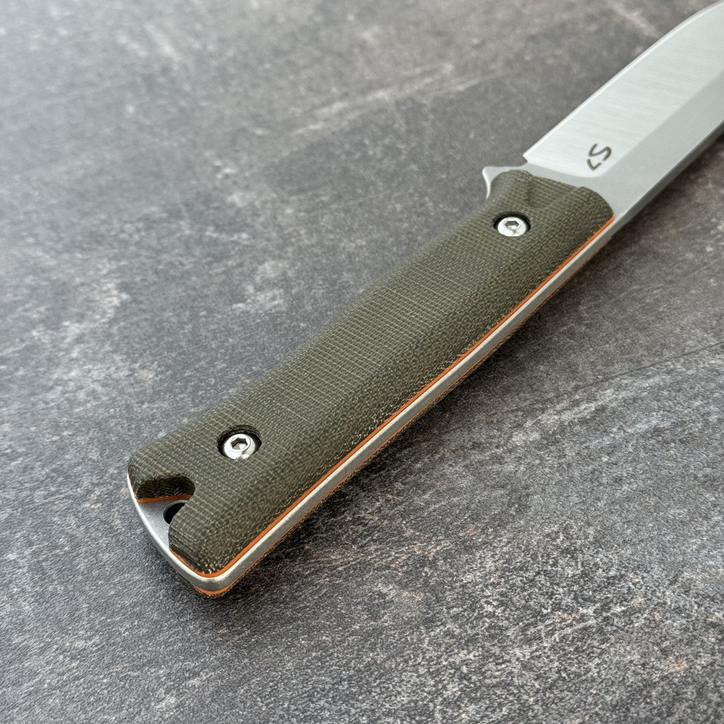 - Rękojeść: Zielona Micarta (Green Canvas Micarta) 0raz pomarańczowy laminat G10 (Orange G10)