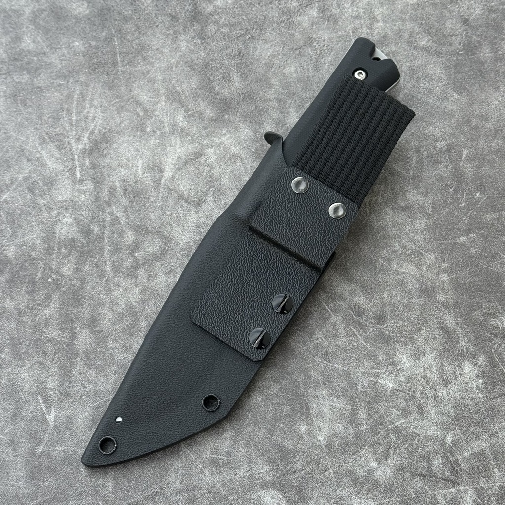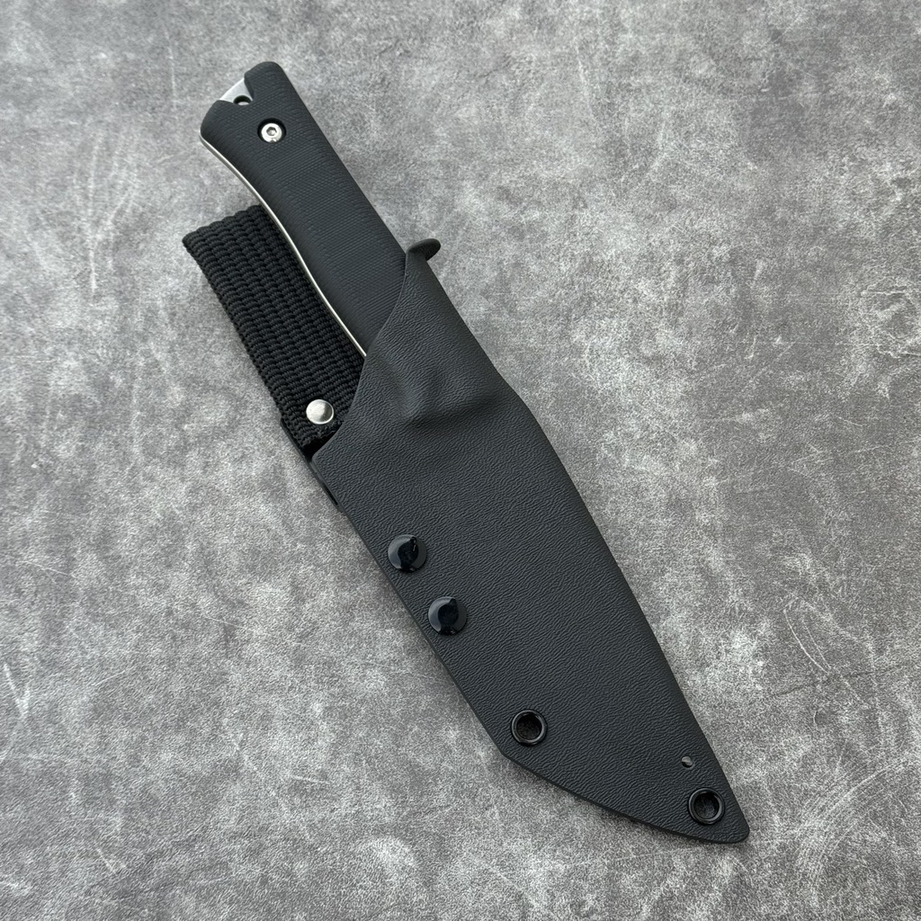 **KYDEX**: Nóż posiada kaburę z ręcznie formowanego tworzywa Kydex cechującego się wysoką odpornością na uderzenia, zarysowania, charakteryzującego się niską chłonnością wilgoci, odpornego na różnorodne warunki atmosferyczne oraz wiele środków chemicznych.