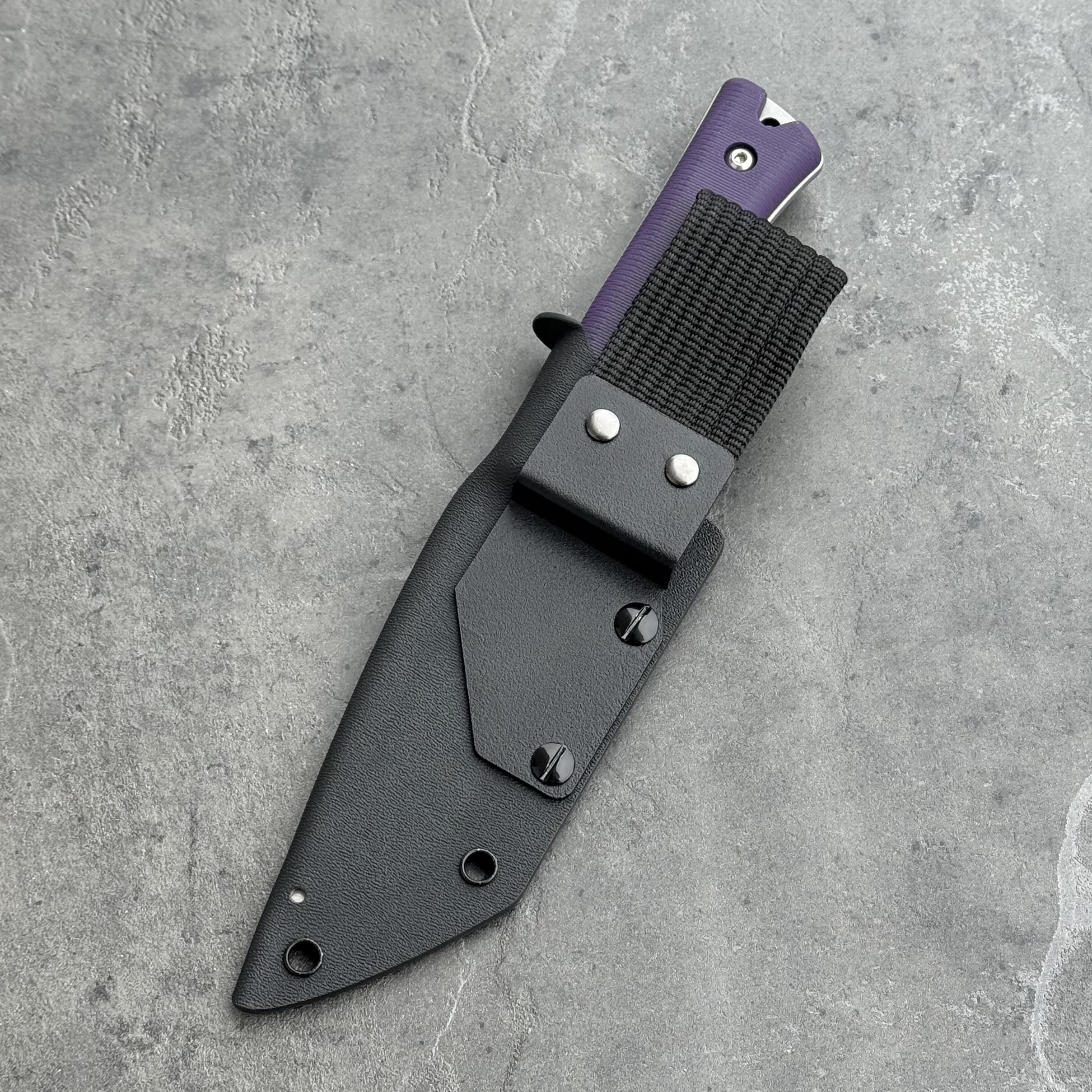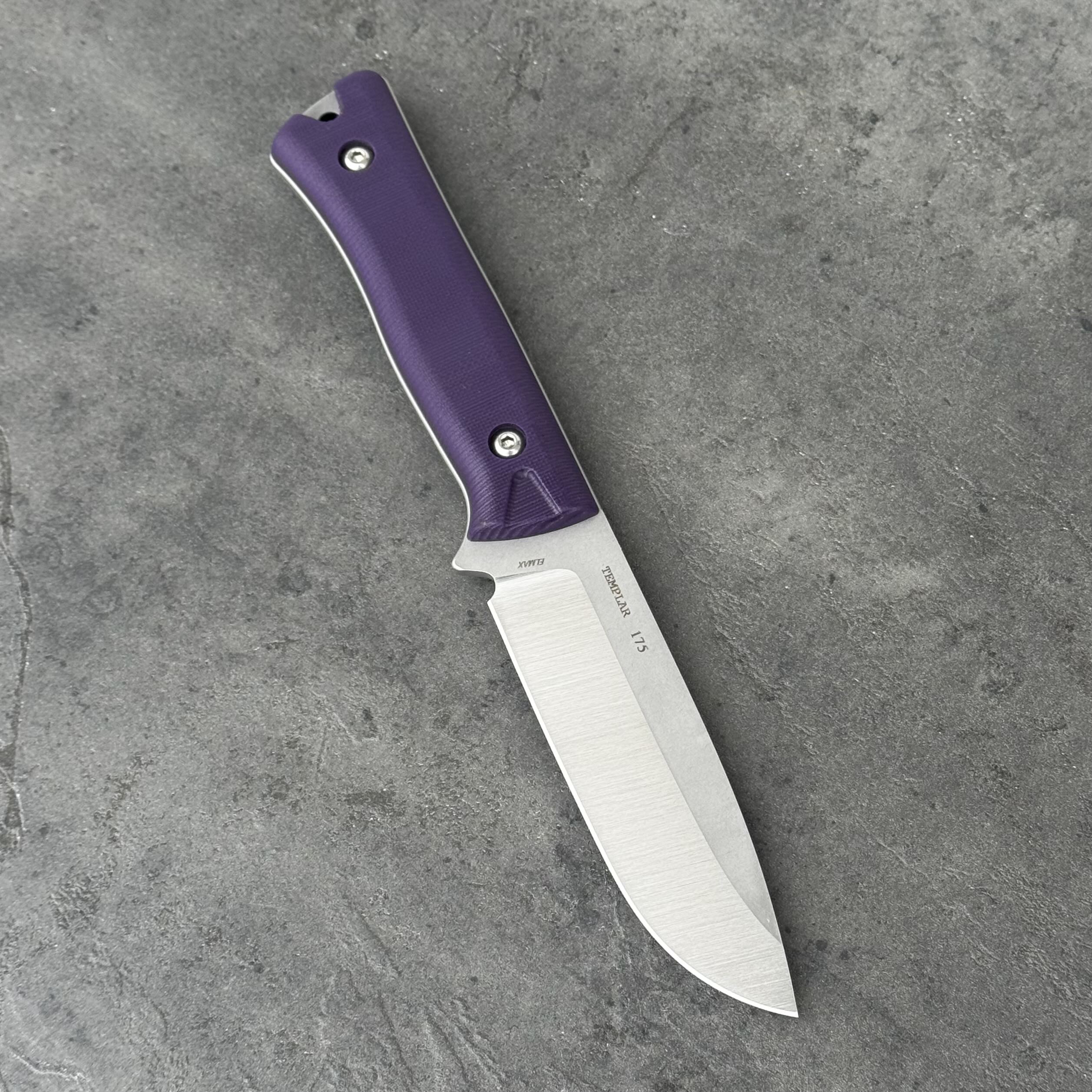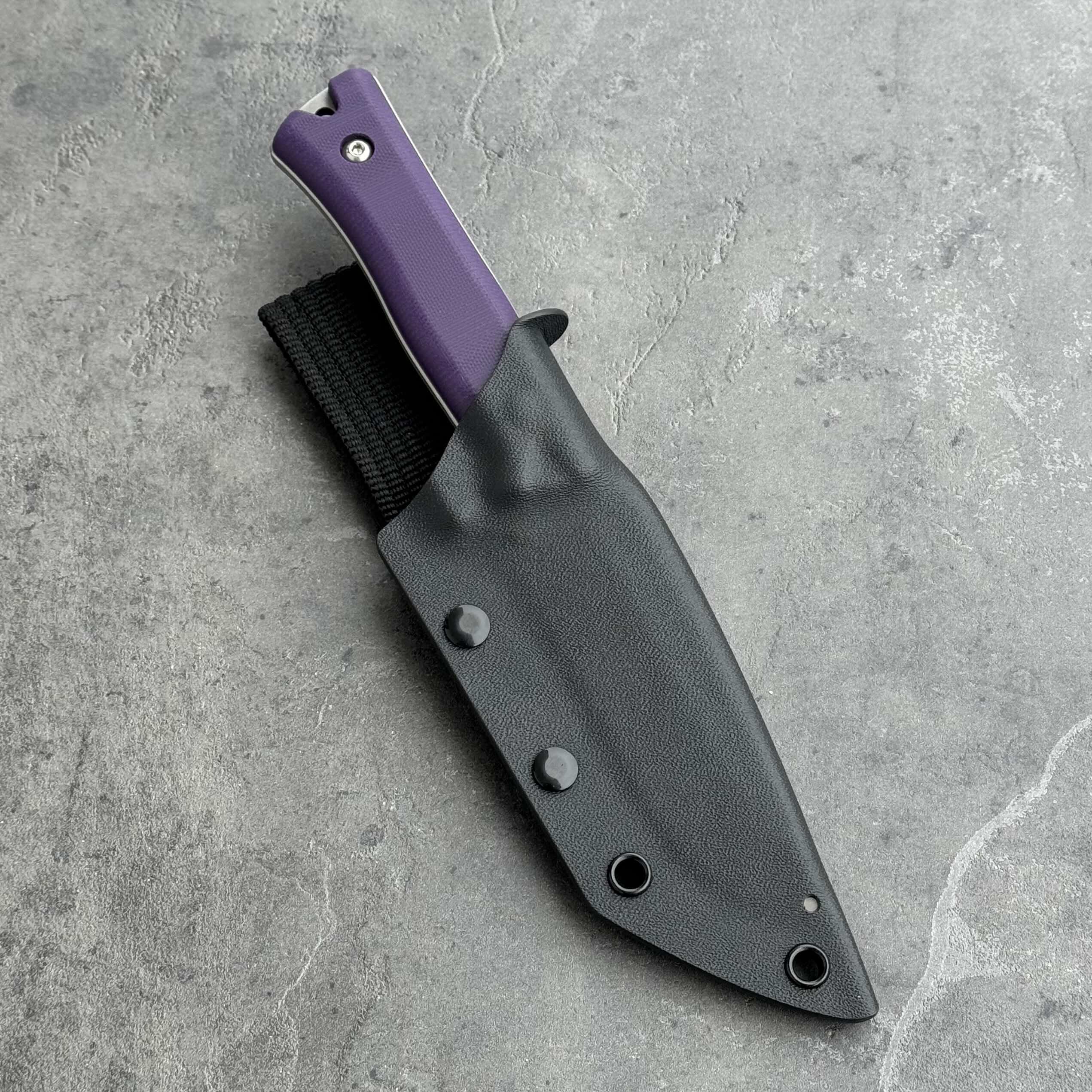 **Templar 'Violet’ posiada ostrze z doskonałej europejskiej stali Elmax o świetnej wytrzymałości i doskonałych właściwościach antykorozyjnych. Okładki rękojeści to fioletowy laminat G10. W komplecie z nożem otrzymujemy pochwę z czarnego Kydexu do przenoszenia i przechowywania noża.