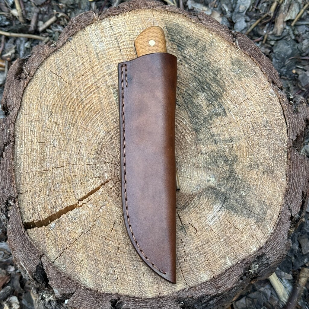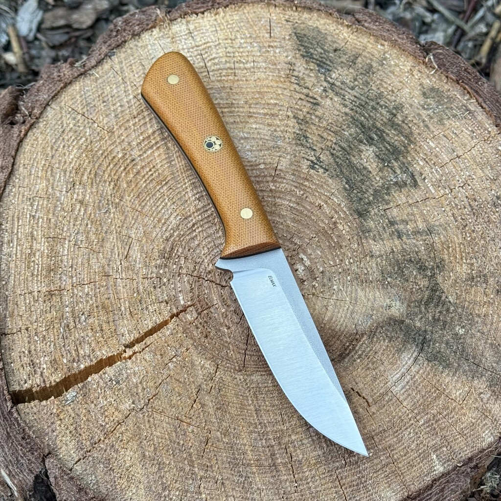 - Rękojeść: Jasnobrązowa Micarta (Natural Micarta) oraz przekładki (liners) z czarnego G10, dwa piny mocujące