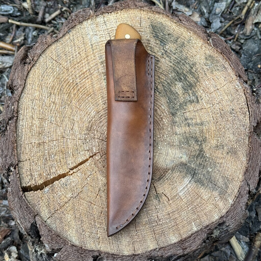 **POCHWA**: Nóż posiada pochwę ze skóry naturalnej garbowanej roślinnie i barwionej na kolor brązowy. Jest to pochwa głęboko chowająca nóż, dla jego maksymalnej stabilności i ochrony przed zgubieniem podczas przenoszenia przy pasku w pozycji pionowej.