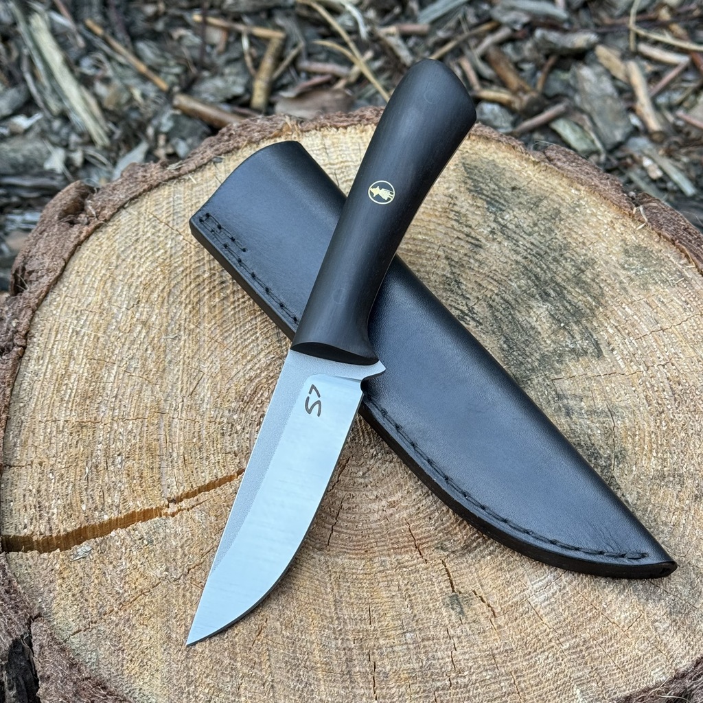 Nóż SJ-Knife Wilczy Pazur 'Włóczykij’ Satyna Elmax Stabilizowany Czarny Grab Czarna Skórzana Pochwa