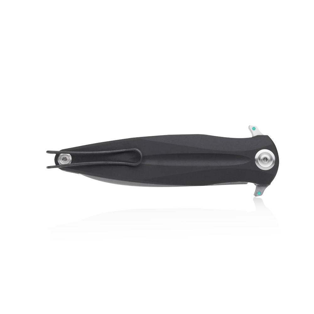 Nóż został wyposażony w dyskretny klips mocujący z odpowiednio wyprofilowanego stalowego drutu. Jest to bardzo ciekawe rozwiązanie, spójne z designem i koncepcją lekkiego noża składanego a w dodatku powodujące że nóż nie rzuca się mocno w oczy kiedy zamocowany jest o skrawek materiału w naszej kieszeni. Klips można mocować po obydwu stronach noża.