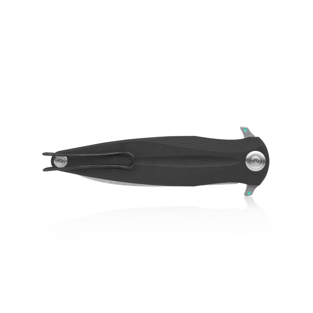 Nóż został wyposażony w dyskretny klips mocujący z odpowiednio wyprofilowanego stalowego drutu. Jest to bardzo ciekawe rozwiązanie, spójne z designem i koncepcją lekkiego noża składanego a w dodatku powodujące że nóż nie rzuca się mocno w oczy kiedy zamocowany jest o skrawek materiału w naszej kieszeni. Klips można mocować po obydwu stronach noża.