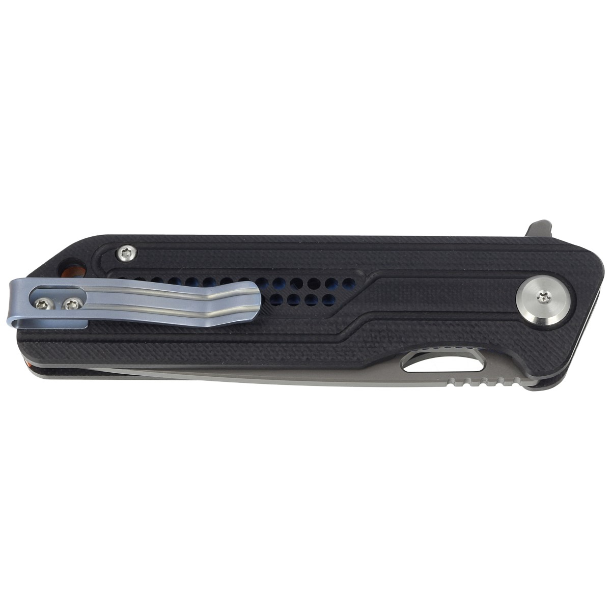 Rękojeść noża wykonana jest z okładzin G10, tworzywa odporowego na warunki atmosferyczne, chemikalia i uszkodzenia mechaniczne. Fazowane krawędzie okładek eliminują ostre ranty, a tekstura powierzchni poprawia pewność chwytu. Seria otworów w okładzinie odciąża nóż. Masywny backspacer, do którego przymocowano okładziny, gwarantuje sztywność i wytrzymałość całej konstrukcji. Jednopozycyjny tytanowy klips po prawej stronie umożliwia przenoszenie noża w pozycji tip-up, z czubkiem ostrza skierowanym ku górze. Ponadto, nad klipsem znajduje się otwór do przewleczenia linki zabezpieczającej lub ozdobnej.