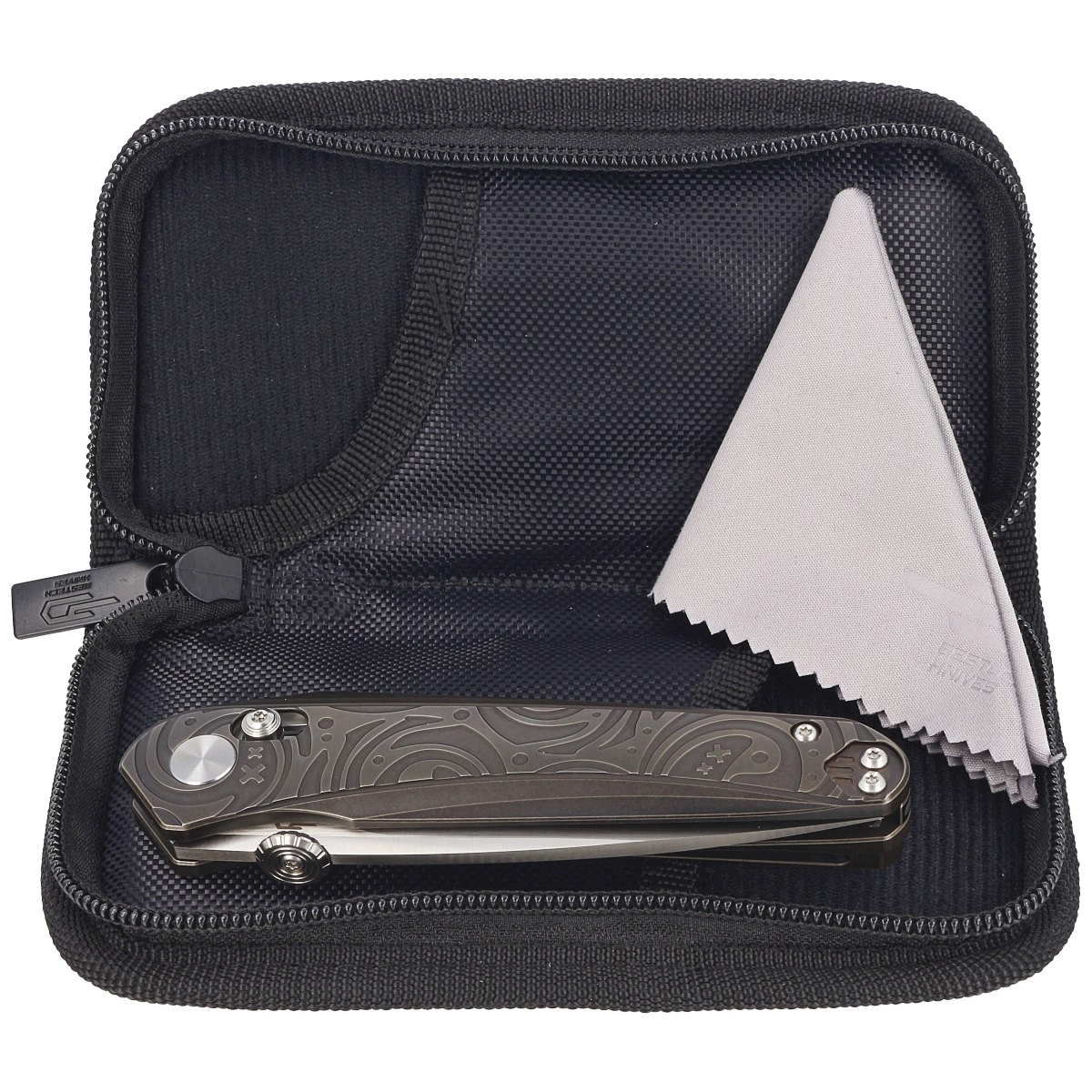 Nóż Mothus Black Bronze Titanium dostarczany jest w miękkim etui z nylonu, zapinanym na zamek, z logo marki. To idealne rozwiązanie do bezpiecznego przechowywania i przenoszenia tego wyjątkowego foldera.