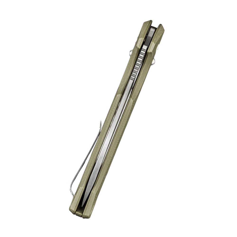 Rękojeść noża wykonana jest z trwałego kompozytu G10, który zapewnia odporność mechaniczną oraz pewny chwyt również w wilgotnych warunkach. Konstrukcja noża została uzupełniona o przekładalny klips kieszeniowy w konfiguracji tip-up, pozwalający na wygodne i dyskretne przenoszenie.