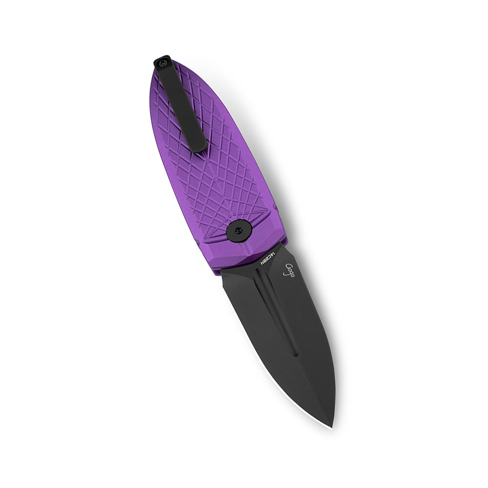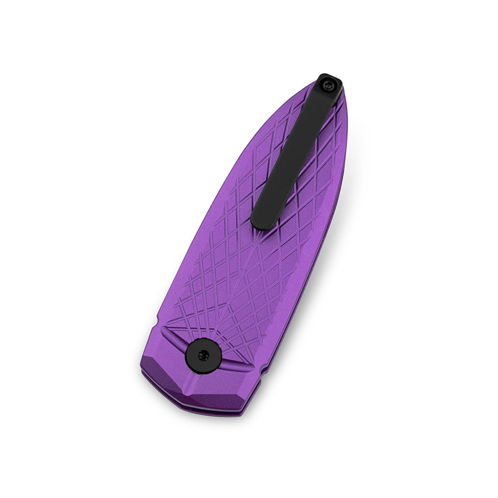 - Rękojeść: okładki z aluminium (fioletowe – purple), stalowy klips mocujący (jednostronny, Tip-Up)