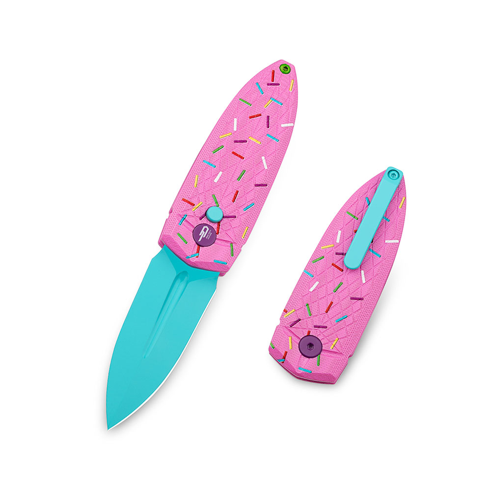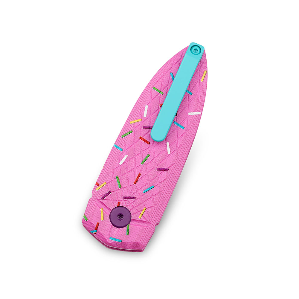 - Rękojeść: okładki z G10 (różowe z wzorem posypki / pink printed sprinkle pattern), stalowy klips mocujący (jednostronny, Tip-Up)
