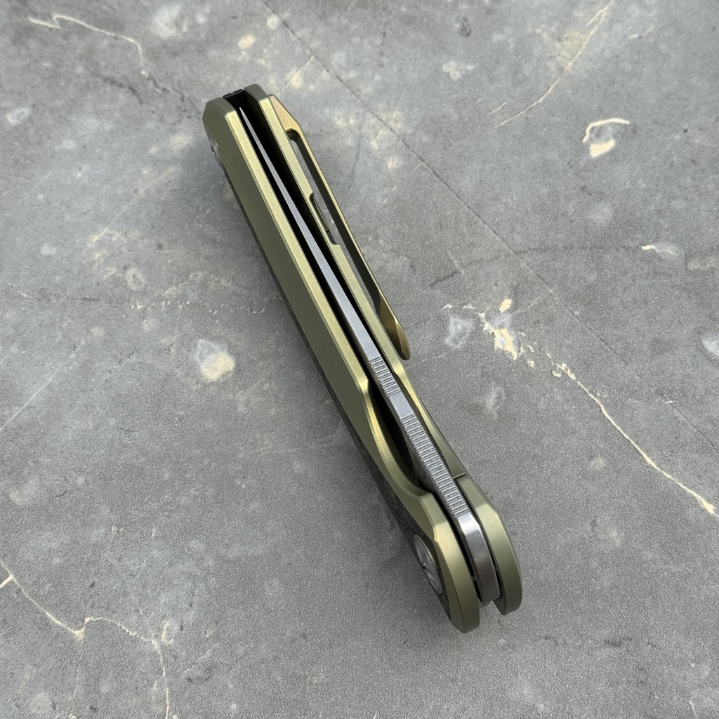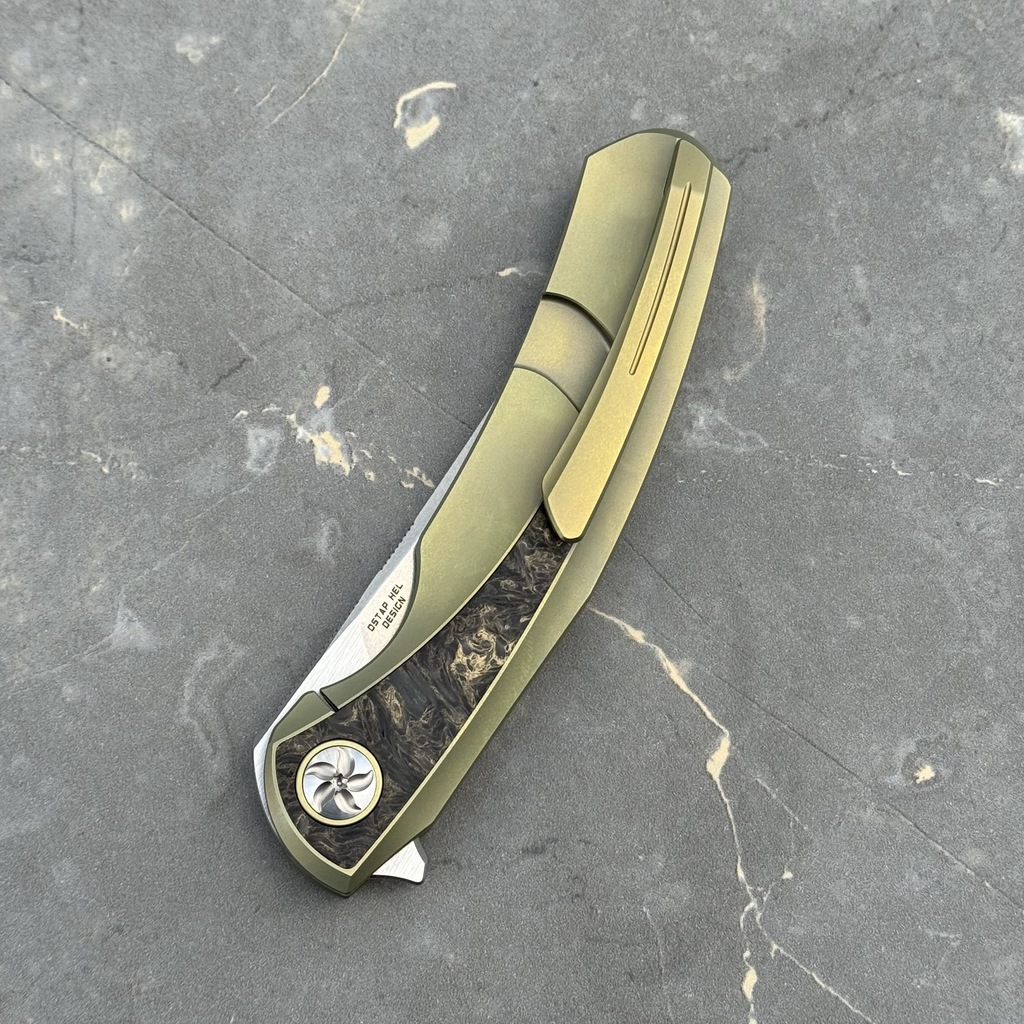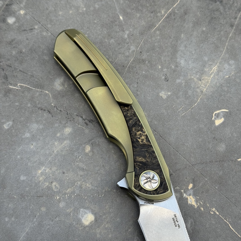 - Rękojeść: Tytan anodyzowany na kolor złoty oraz wstawki z włókna węglowego FatCarbon Dark Matter Gold, tytanowy klips mocujący (nieprzekładalny, Tip-Up)