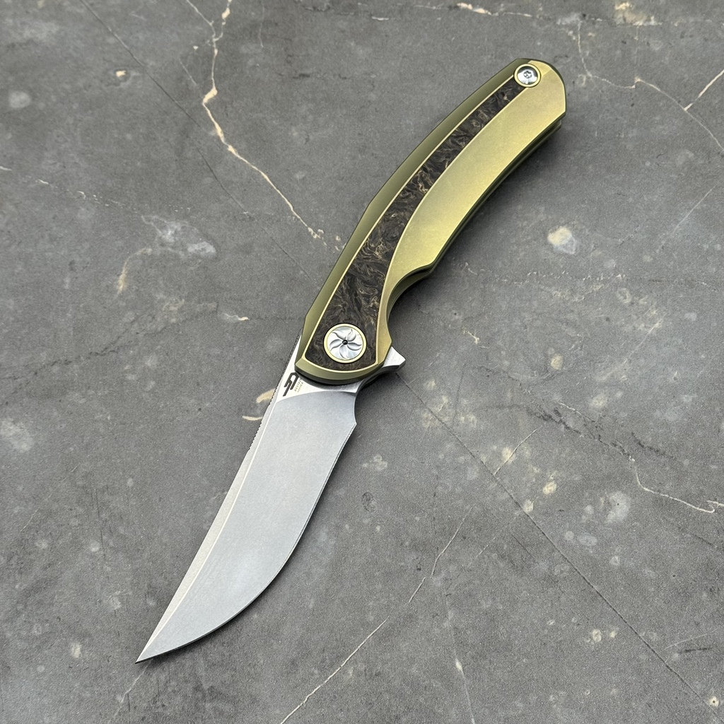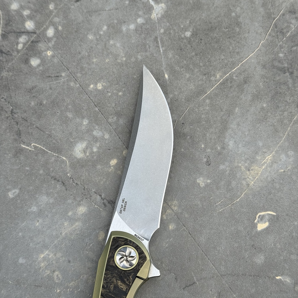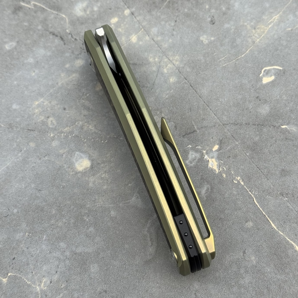 - Rękojeść: Tytan anodyzowany na kolor złoty oraz wstawki z włókna węglowego FatCarbon Dark Matter Gold, tytanowy klips mocujący (nieprzekładalny, Tip-Up)