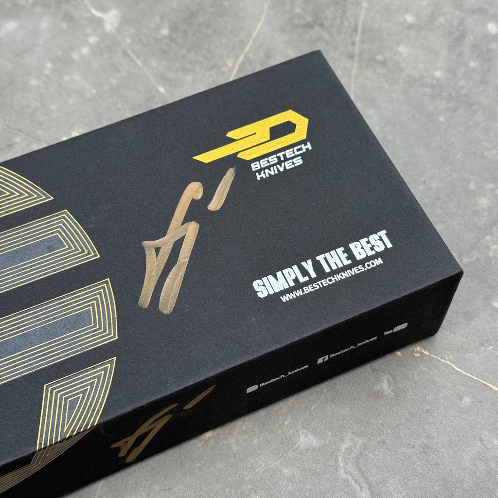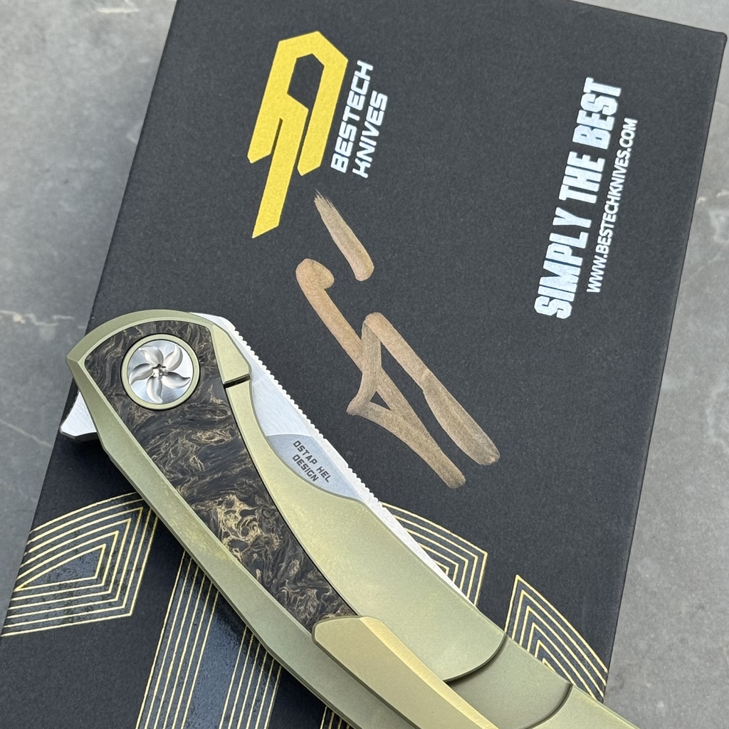 Nóż Składany Bestech Sambac BT2402A by Ostap Hel – SPECJALNY SET KOLEKCJONERSKI Z AUTOGRAFEM | Stonewash MagnaCut Gold Titanium & Dark Matter Gold FatCarbon Inlays