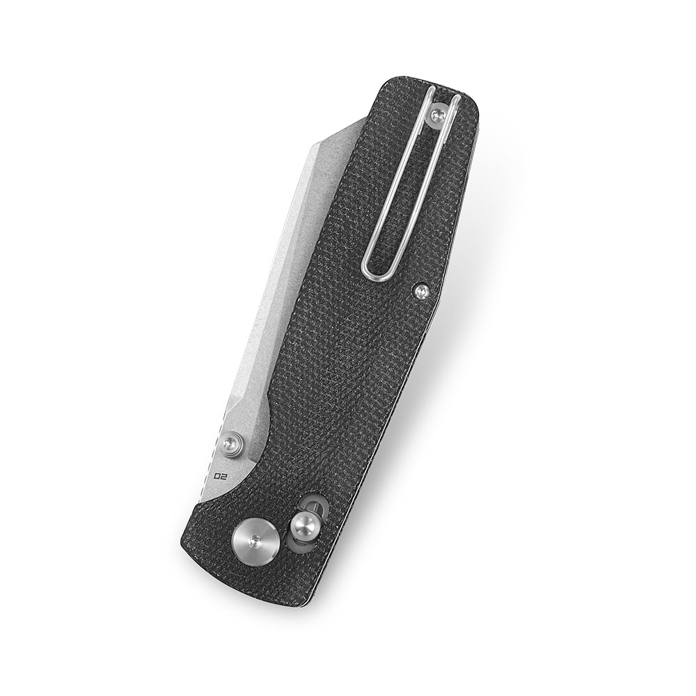 - Rękojeść: stalowe linersy, okładki z czarnej micarty (black micarta), stalowy kołek, stalowy klips mocujący (obustronny, tip-up, deep carry)