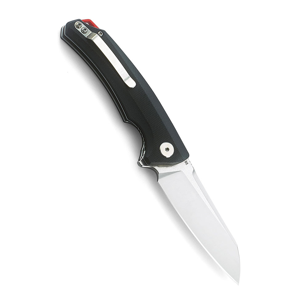 - Rękojeść: stalowe linersy, okładki z czarnego G10, czerwony backspacer, stalowy klips mocujący (jednostronny, Tip-Up)