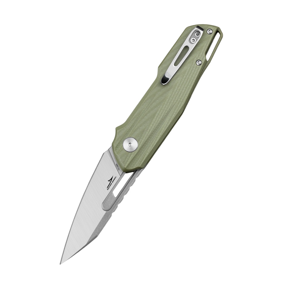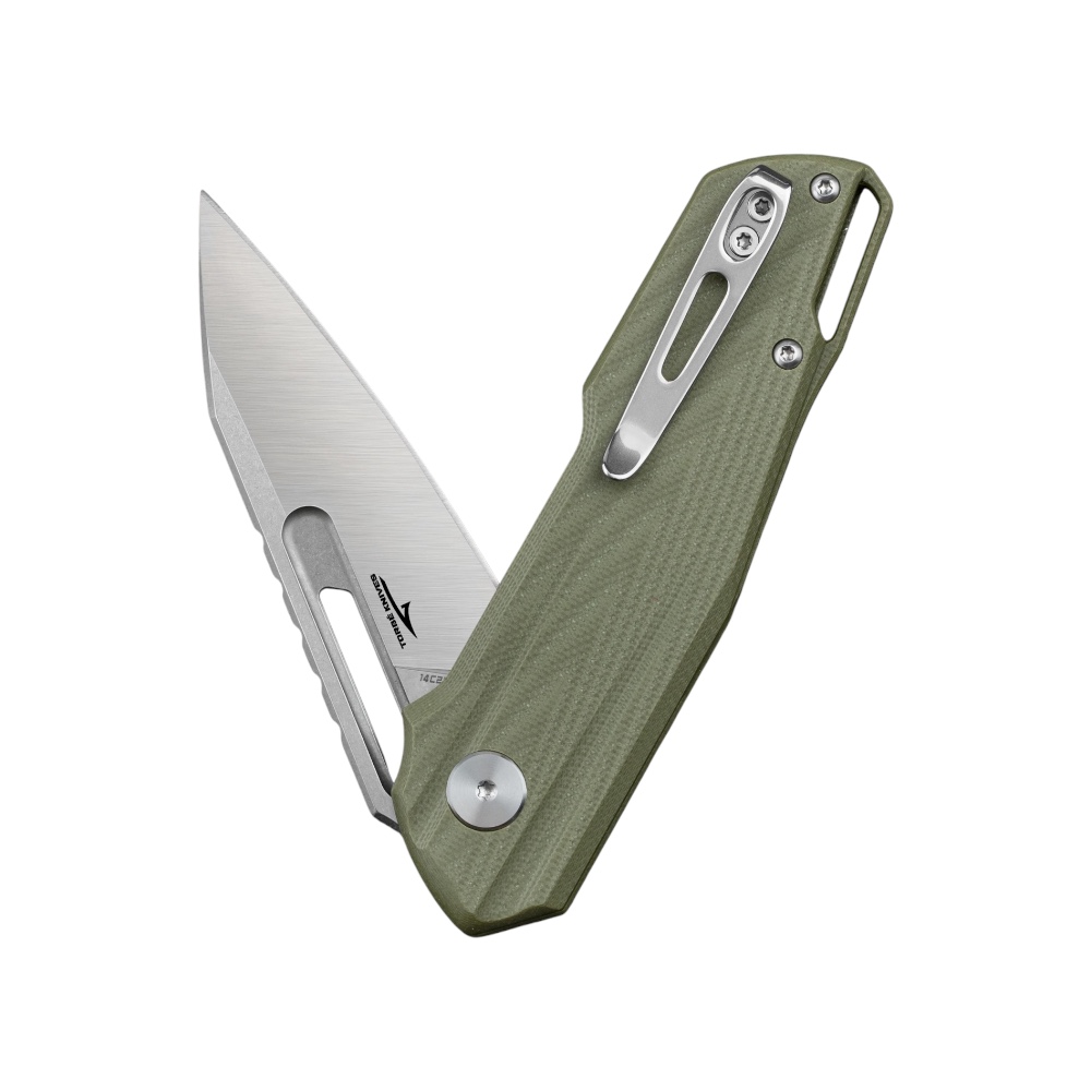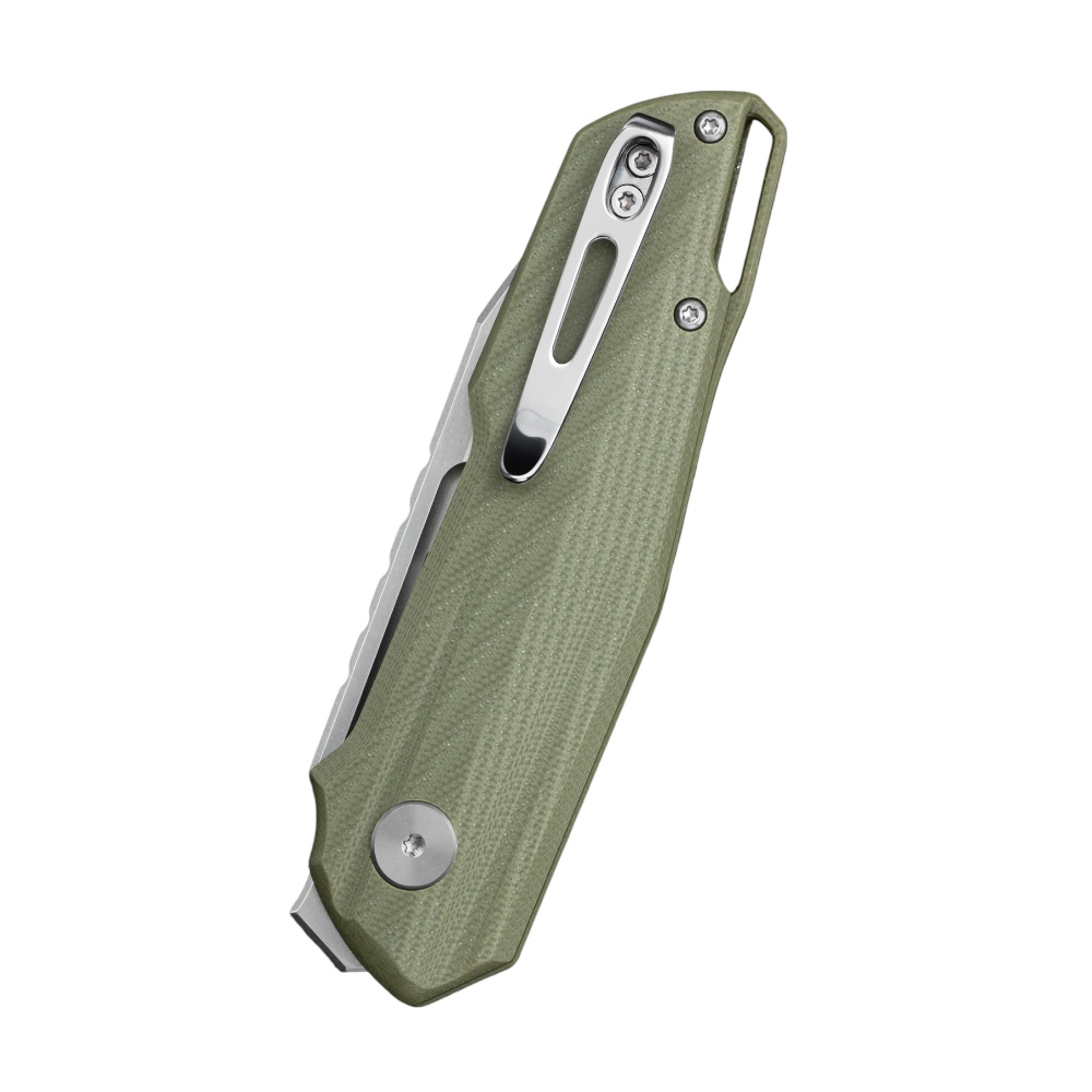Rękojeść wykonano z kompozytu G10, materiału odpornego na uszkodzenia mechaniczne i zmienne warunki atmosferyczne. Teksturowana powierzchnia poprawia chwytność, a ergonomiczne wyprofilowanie zwiększa komfort użytkowania. Konstrukcję uzupełnia stalowy klips kieszeniowy w konfiguracji tip-up, umożliwiający wygodne przenoszenie.