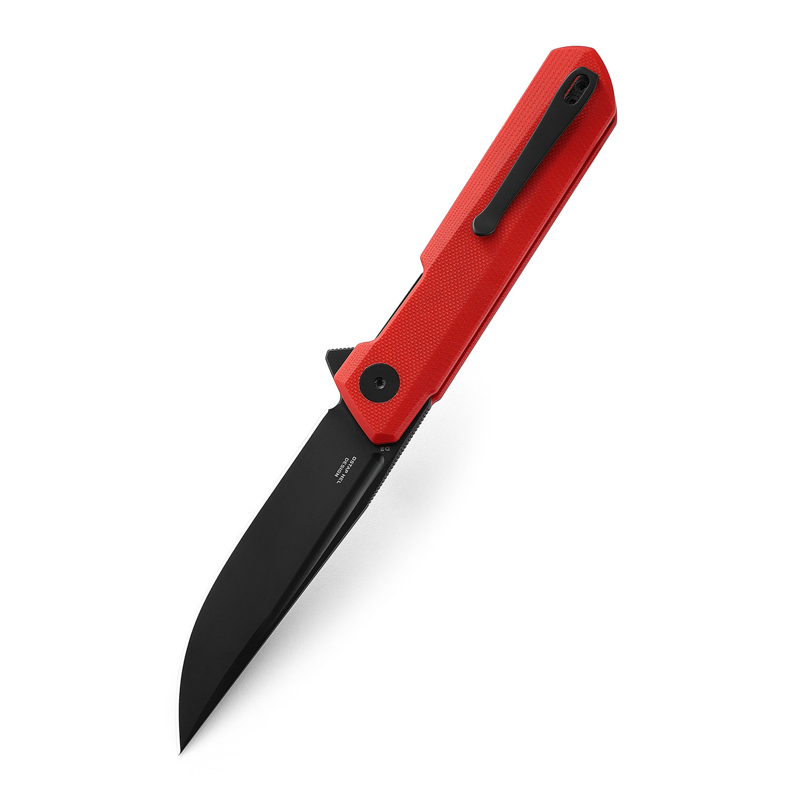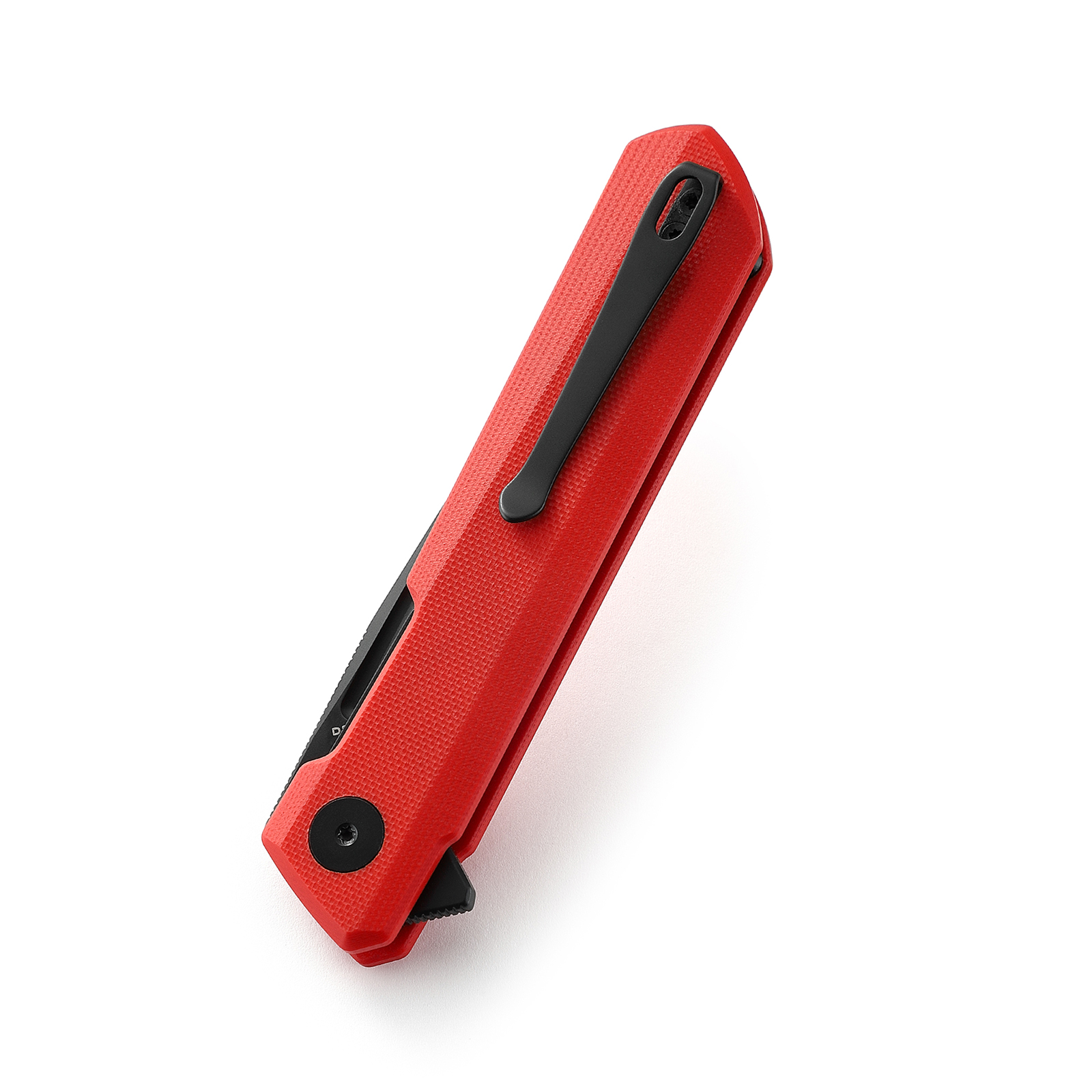 - Rękojeść: stalowe linersy, okładki z czerwonego G10 (red G10), stalowy klips mocujący (przekładalny, Tip-Up)