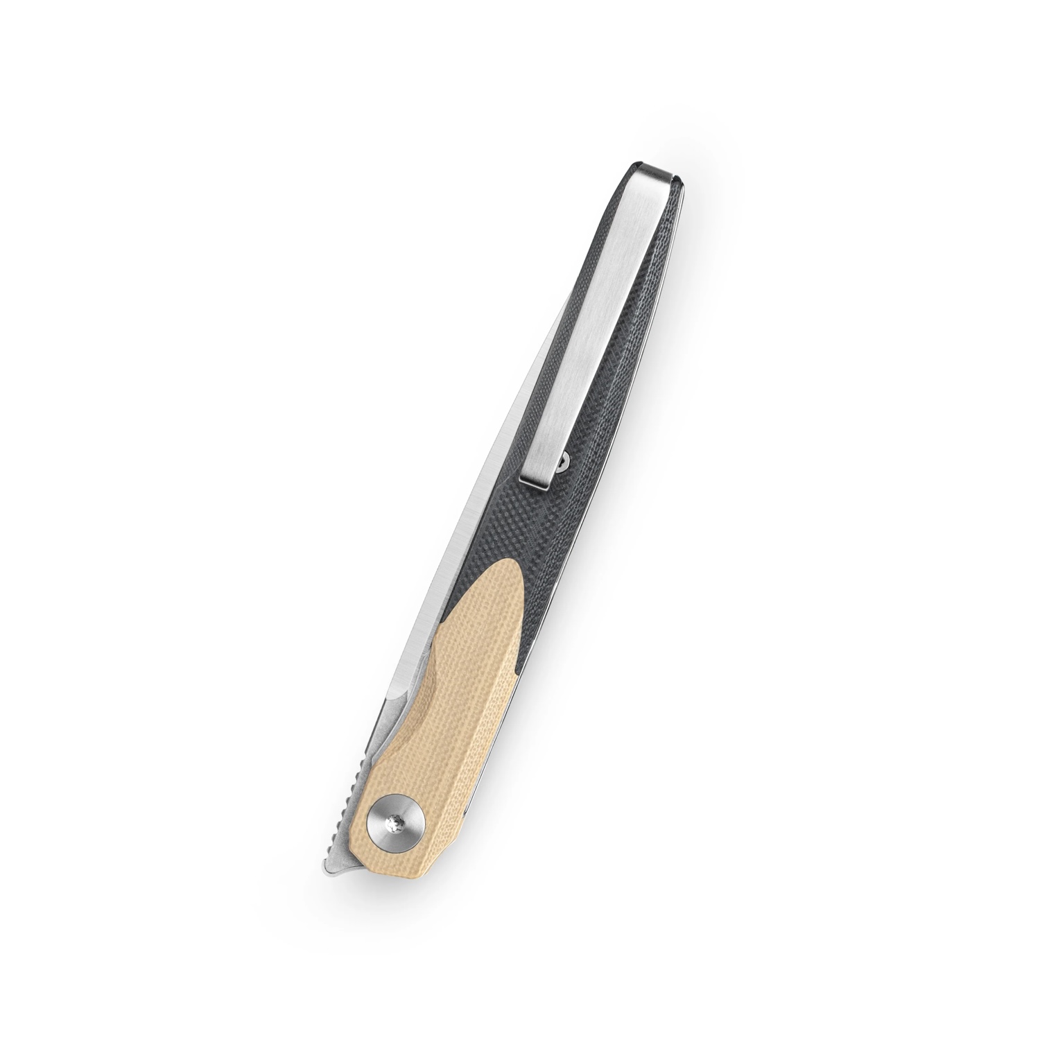 Rękojeść noża wykonana jest z dwukolorowych okładzin G10 (khaki + czarny), które zapewniają trwałość, lekkość i pewny chwyt nawet w wilgotnych warunkach. Front flipper oraz łożyska kulkowe gwarantują płynne i szybkie otwieranie jedną ręką, a blokada liner lock zapewnia bezpieczeństwo użytkowania podczas pracy.