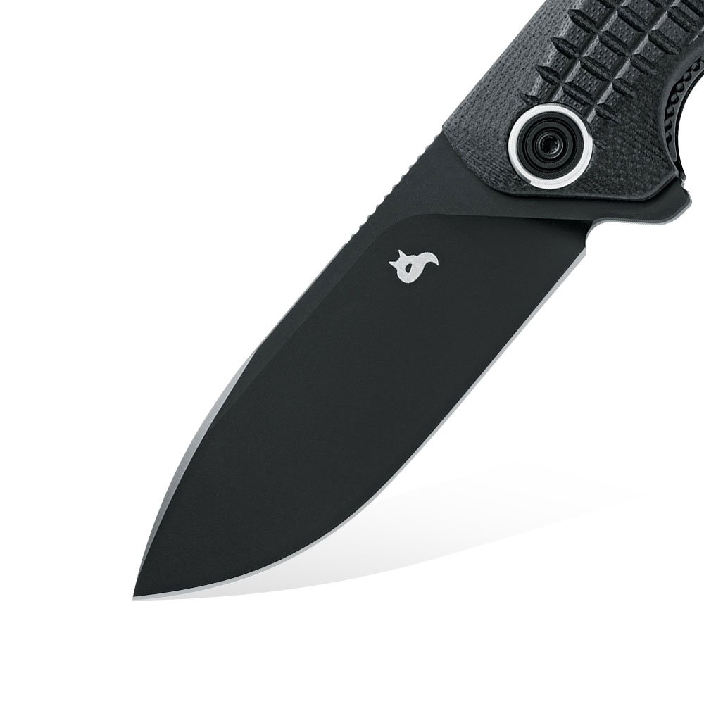 Ostrze noża wykonane zostało ze stali narzędziowej D2. Stal ta ma bardzo dobre właściwości tnące, świetną agresję cięcia i łatwo się ostrzy. Nie jest przy tym stalą całkowicie nierdzewną o czym warto pamiętać i odpowiednio ją pielęgnować. Głownia w stylu sheepsfoot posiada szlif płaski a jej wykończenie to black PTTE. Do otwierania noża służy obustronny kołek.