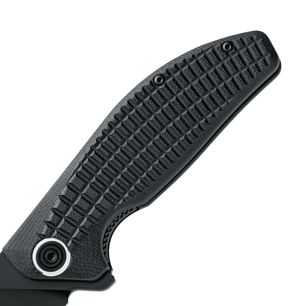 - Rękojeść: okładki z czarnego G10 (black), stalowy jednostronny klips mocujący (black PTFE stainless steel, Tip-Up), backspacer ze stali nierdzewnej (black PTFE stainless steel), śruby ze stali nierdzewnej (black PTFE stainless steel)