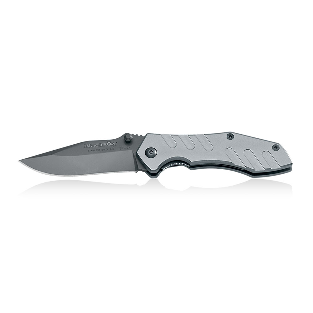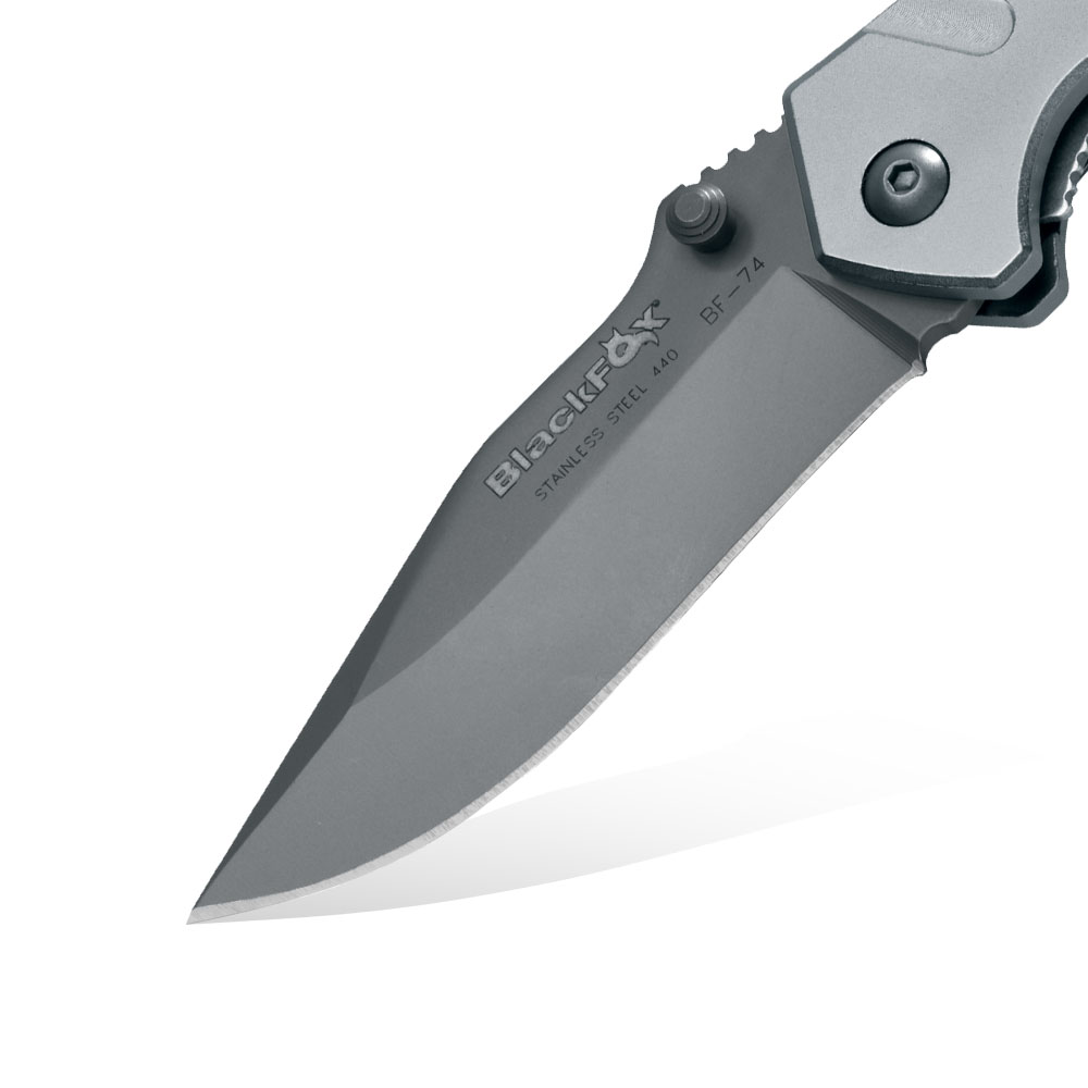 Prezentowany BF-74 posiada głownię clip point ze szlifami wklęsłym oraz tytanowym, antyrefleksyjnym i twardym pokryciem dla ukrywania ewentualnych rys. Otwierany jest obustronnymi kołkami pozwalającymi na szybkie rozłożenie noża a za blokowanie odpowiada blokada typu liner lock. Rękojeść wykonana została z aluminium także pokrytym powłoką tytanową. Całość uzupełnia mocny, stalowy klips (Tip-Down).