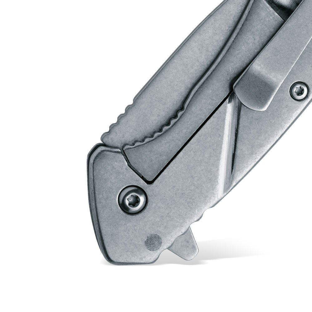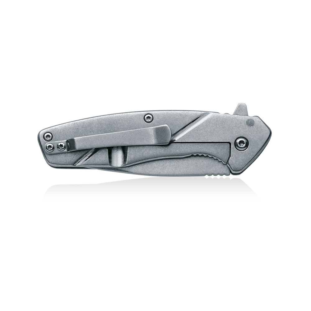 Nóż posiada masywny klips (Tip-Up) zamontowany na zakończeniu rękojeści , który umożliwia przenoszenie zamkniętego noża wierzchołkiem do góry. Klips, podobnie jak reszta noża, wykonany został ze stali nierdzewnej.