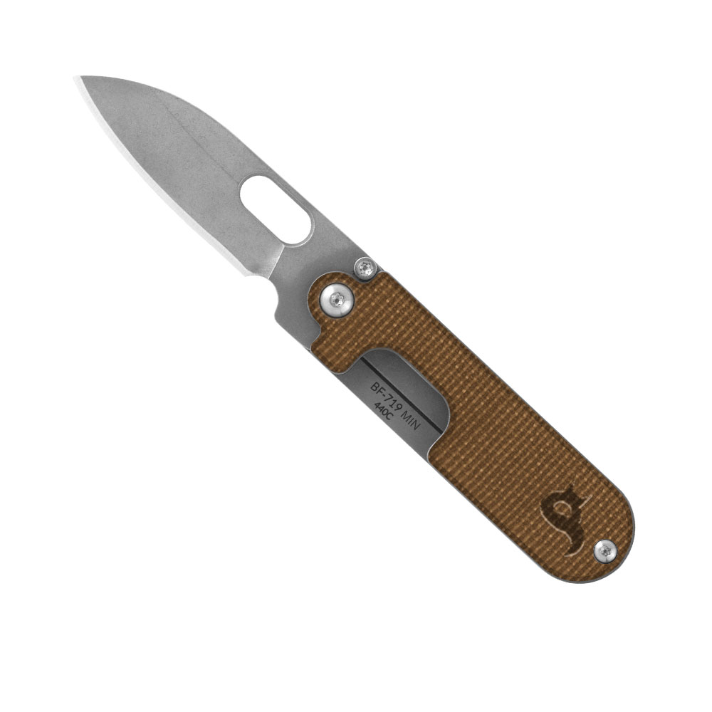 Nóż składany Black FOX Bean Gen2 BF-719 MIN Natural Micarta by Serge Panchenko posiada głownię typu sheepsfoot ze stali nierdzewnej 440C (satynowane wykończenie) oraz rękojeść ze stali i brązowej micarty. Ostrze noża otwieramy jedną ręką używając do tego otworu w głowni lub oburącz. Nóż wyposażony został w stalowy klips mocujący.