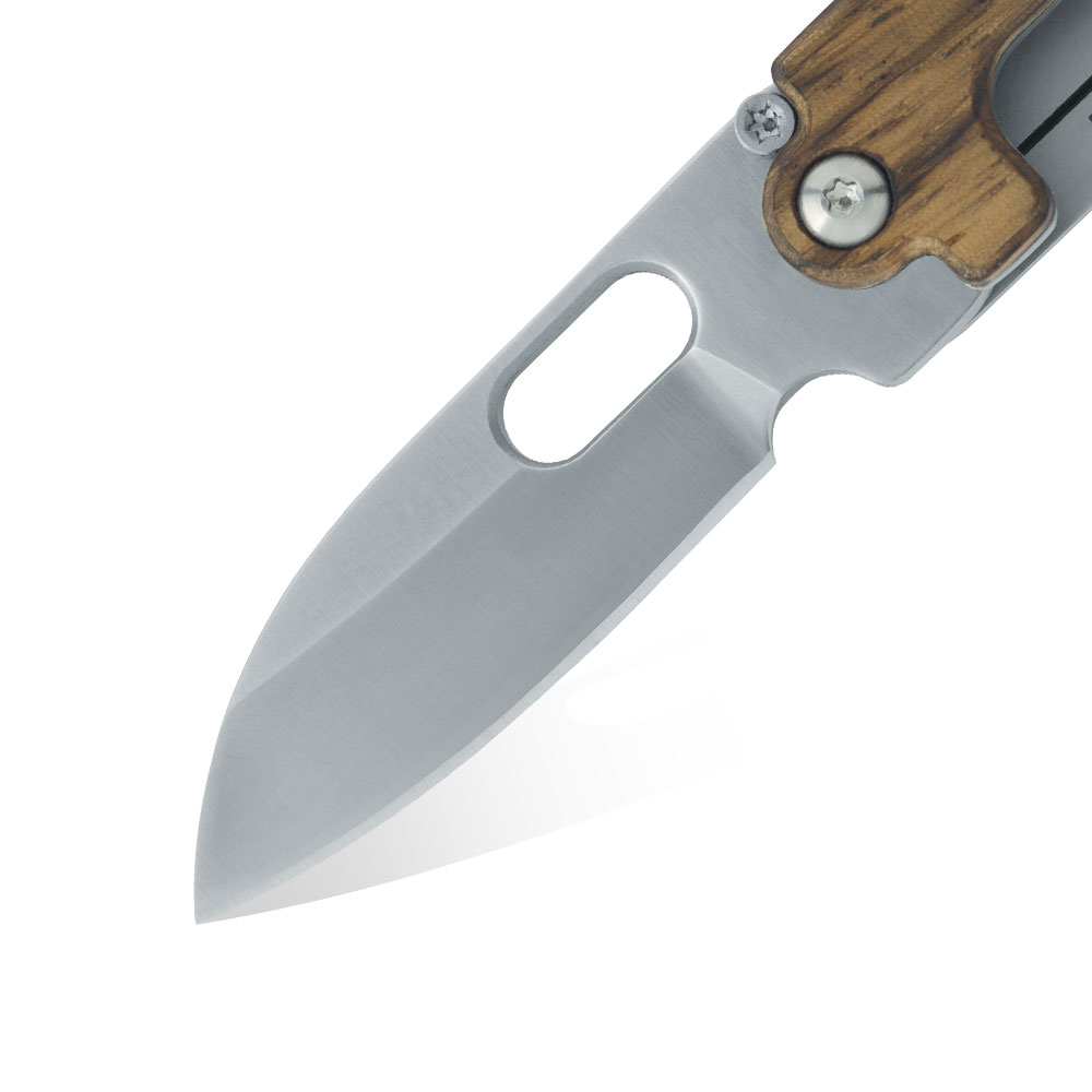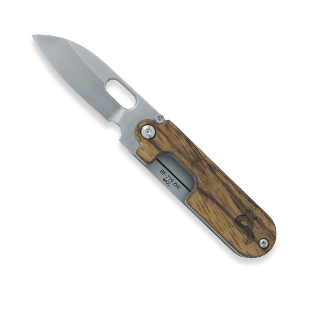 Nóż składany Black FOX Bean Gen2 BF-719 ZW Zebra Wood by Serge Panchenko posiada głownię typu sheepsfoot ze stali nierdzewnej 440C (satynowane wykończenie) oraz rękojeść ze stali i drewna Zebra Wood. Ostrze noża otwieramy jedną ręką używając do tego otworu w głowni lub oburącz. Nóż wyposażony został w stalowy klips mocujący.