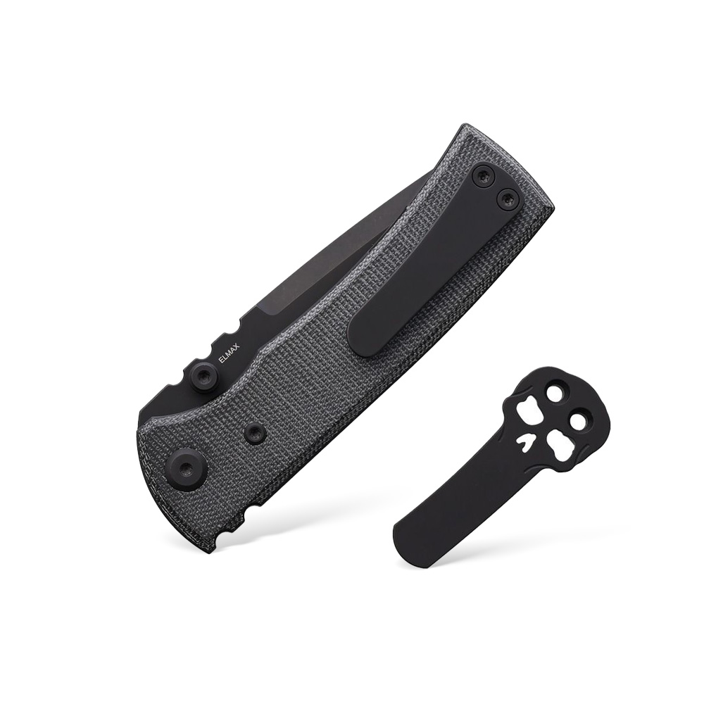 - Rękojeść: Stalowy korpus (wykończenie PVD), okładki z czarnej Micarty (Black Canvas Micarta), stalowe śruby torx, stalowy klips (wykończenie PVD)