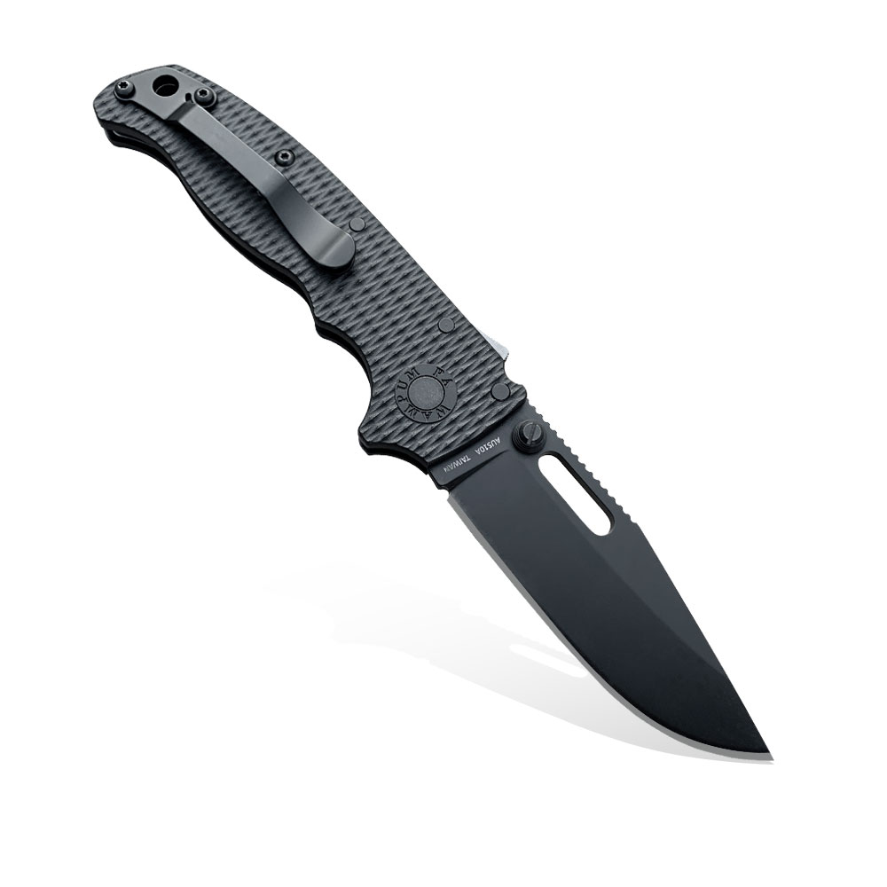 Okładki rękojeści oraz backspacer wykonane zostały z wytrzymałego tworzywa grivory i osadzone na stalowym korpusie (linersy). W rękojeści zaprojektowano otwór na paracord, sznurek, smycz itd., bądź opcjonalne podpięcie ozdoby w zależności od preferencji użytkownika.