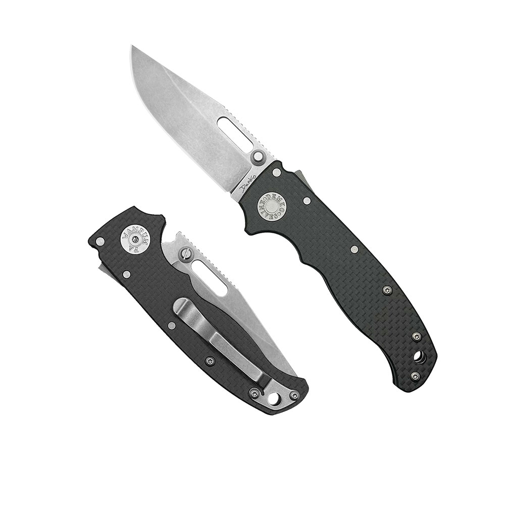 Okładki rękojeści oraz backspacer wykonane zostały z wytrzymałego włókna węglowego i osadzone na stalowym korpusie (linersy). W rękojeści zaprojektowano otwór na paracord, sznurek, smycz itd., bądź opcjonalne podpięcie ozdoby w zależności od preferencji użytkownika.