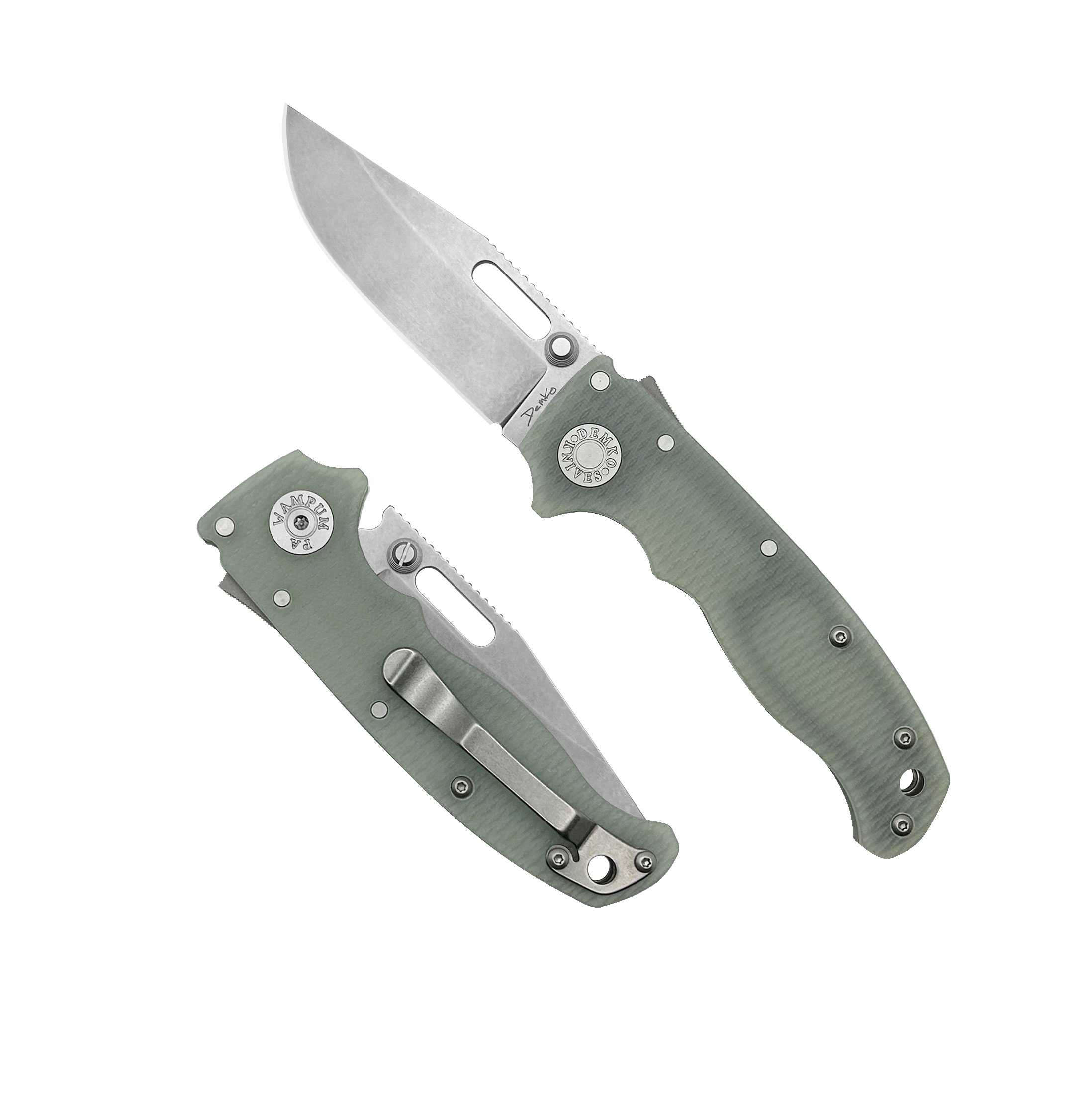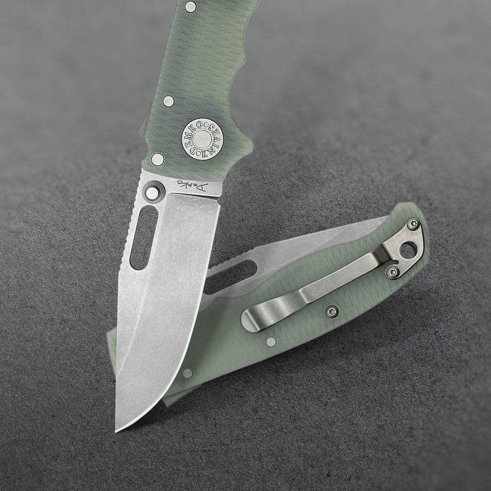 Okładki rękojeści oraz backspacer wykonane zostały z wytrzymałego kompozytu G10 i osadzone na stalowym korpusie (linersy). W rękojeści zaprojektowano otwór na paracord, sznurek, smycz itd., bądź opcjonalne podpięcie ozdoby w zależności od preferencji użytkownika.