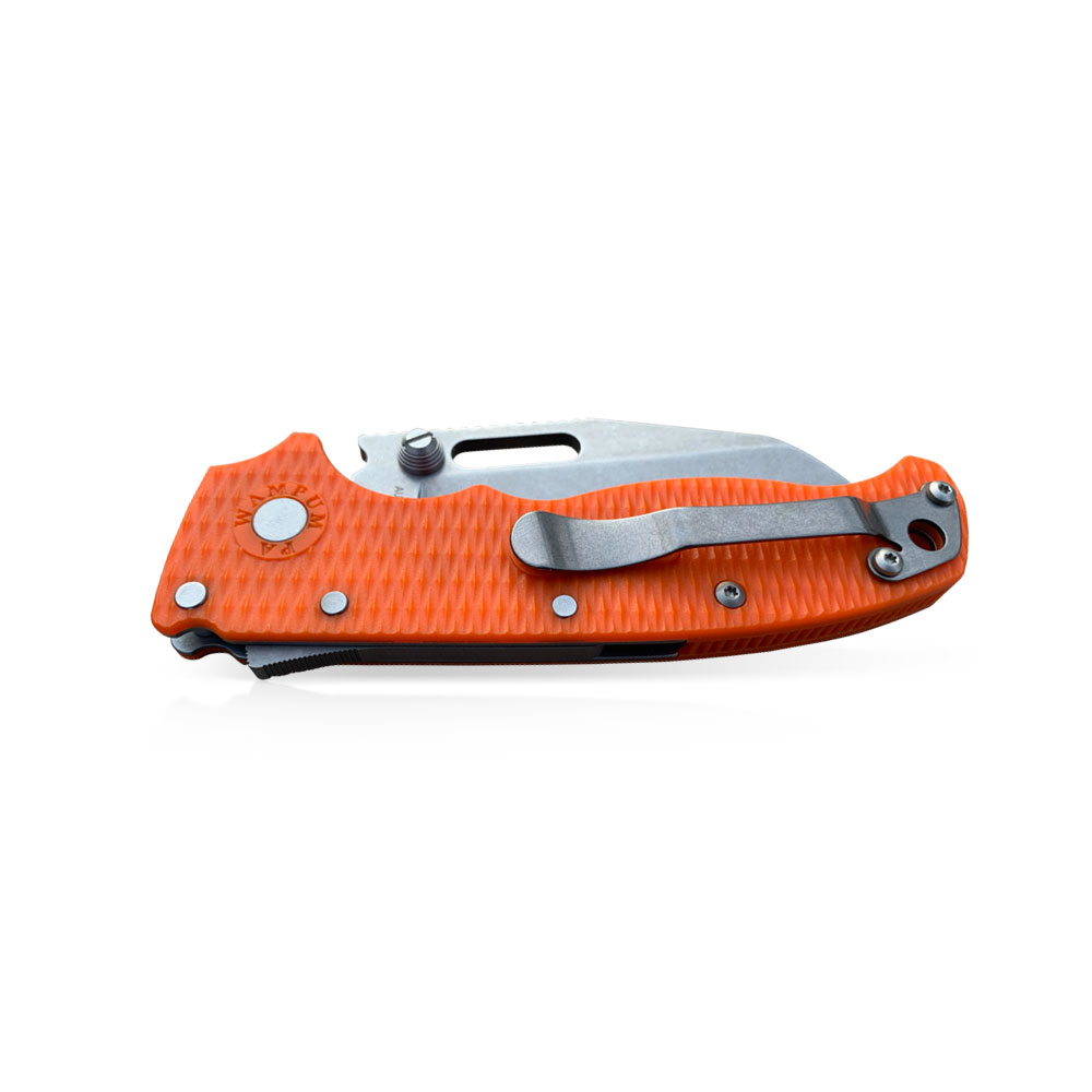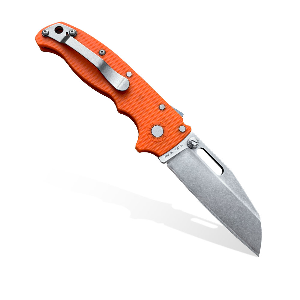 Prezentowany nóż składany Demko Knives AD20.5 Shark Foot AUS10A Shark Lock Orange Grivory Pomarańczowy posiada ostrze o roboczym profilu shark foot (sheeps foot) z japońskiej nierdzewnej stali AUS10A wykończonej w stylu stonewash, rękojeść z pomarańczowego tworzywa grivory oraz blokadę Shark Lock™.