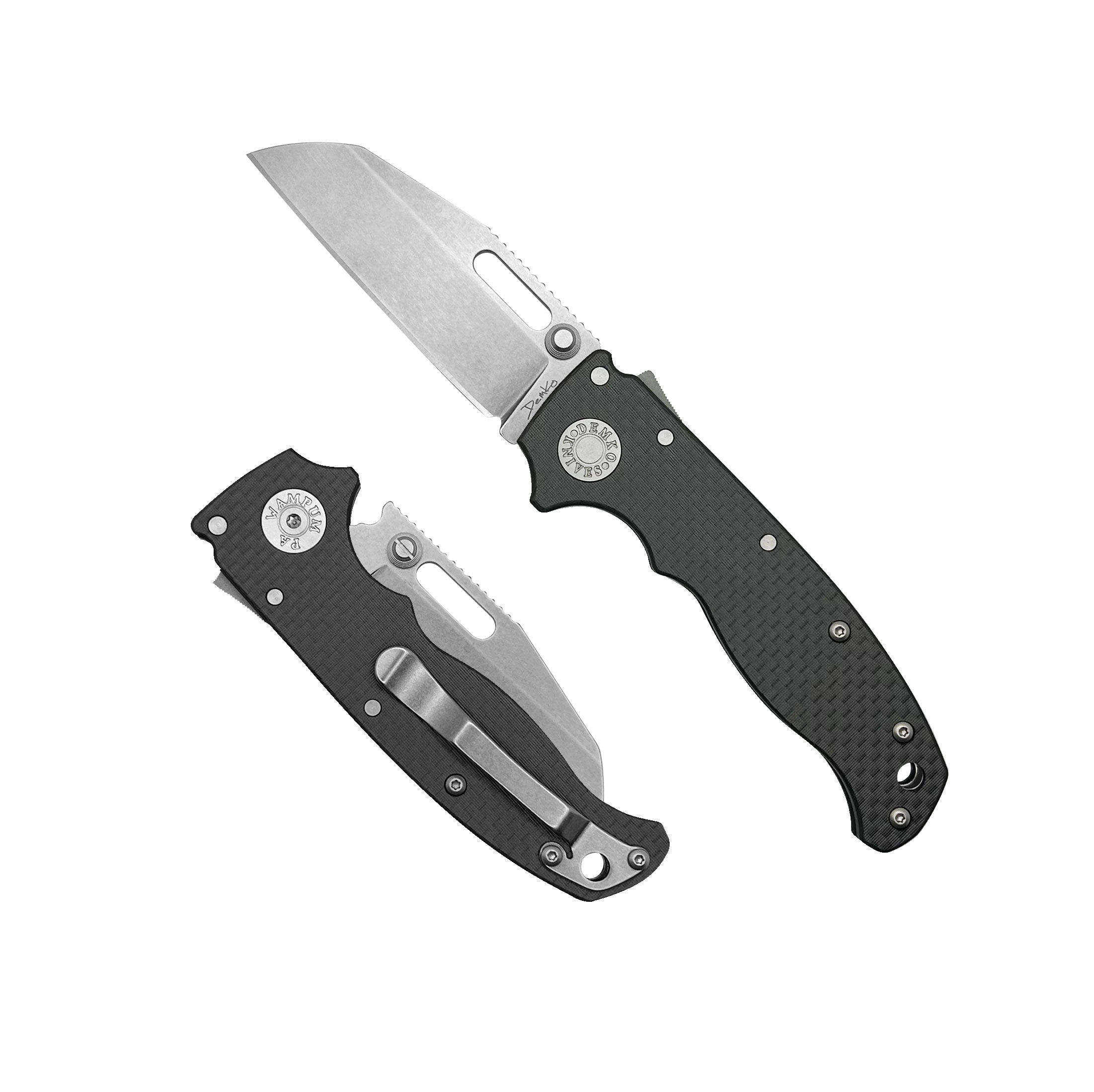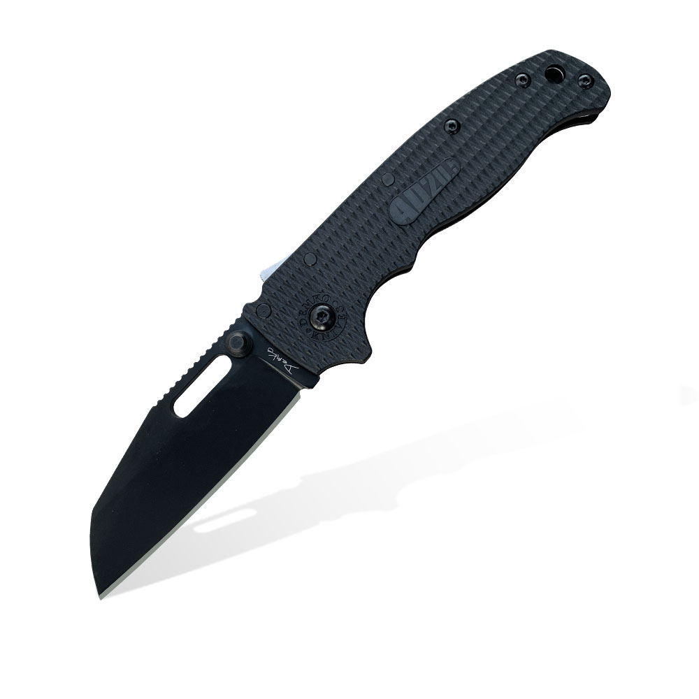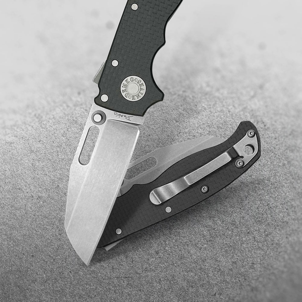 - Rękojeść: stalowe linersy, okładki włókna węglowego, stalowy klips mocujący (Tip-Up)