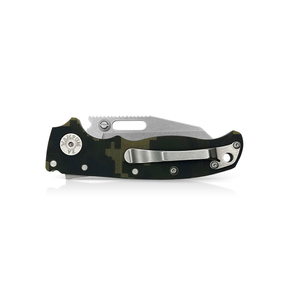 Prezentowany nóż składany Demko Knives AD20.5 Shark Foot S35VN Shark Lock Digi Camo G10 posiada ostrze o roboczym profilu shark foot (sheepsfoot) ze szlifem płaskim z nierdzewnej stali CPM S35VN, wykończenie stonewash, rękojeść z kompozytu G10 oraz blokadę Shark Lock™.
