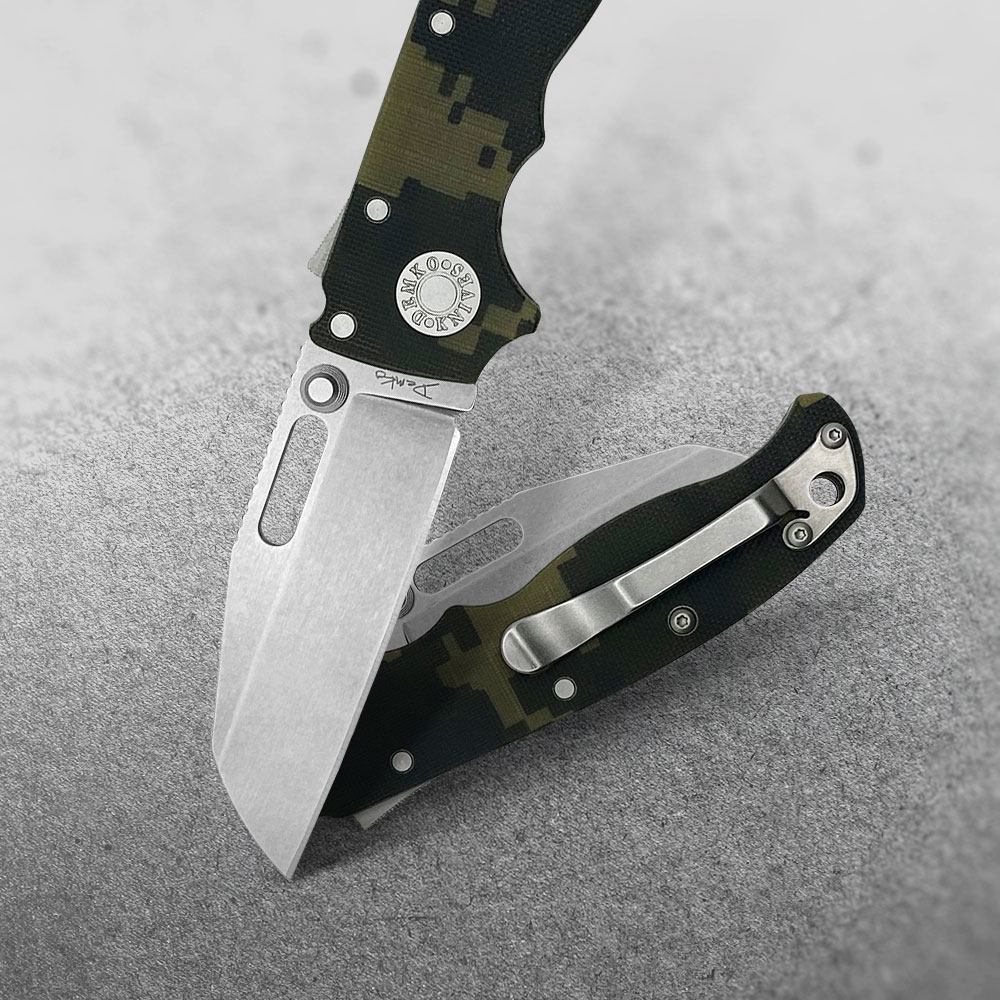 Okładki rękojeści oraz backspacer wykonane zostały z wytrzymałego kompozytu G10 i osadzone na stalowym korpusie (linersy). W rękojeści zaprojektowano otwór na paracord, sznurek, smycz itd., bądź opcjonalne podpięcie ozdoby w zależności od preferencji użytkownika.