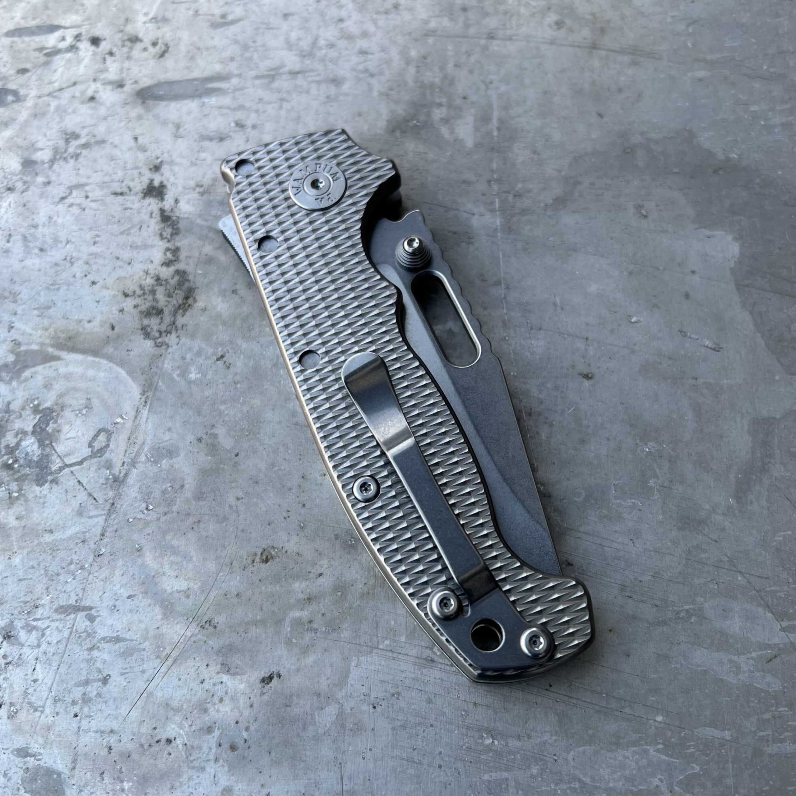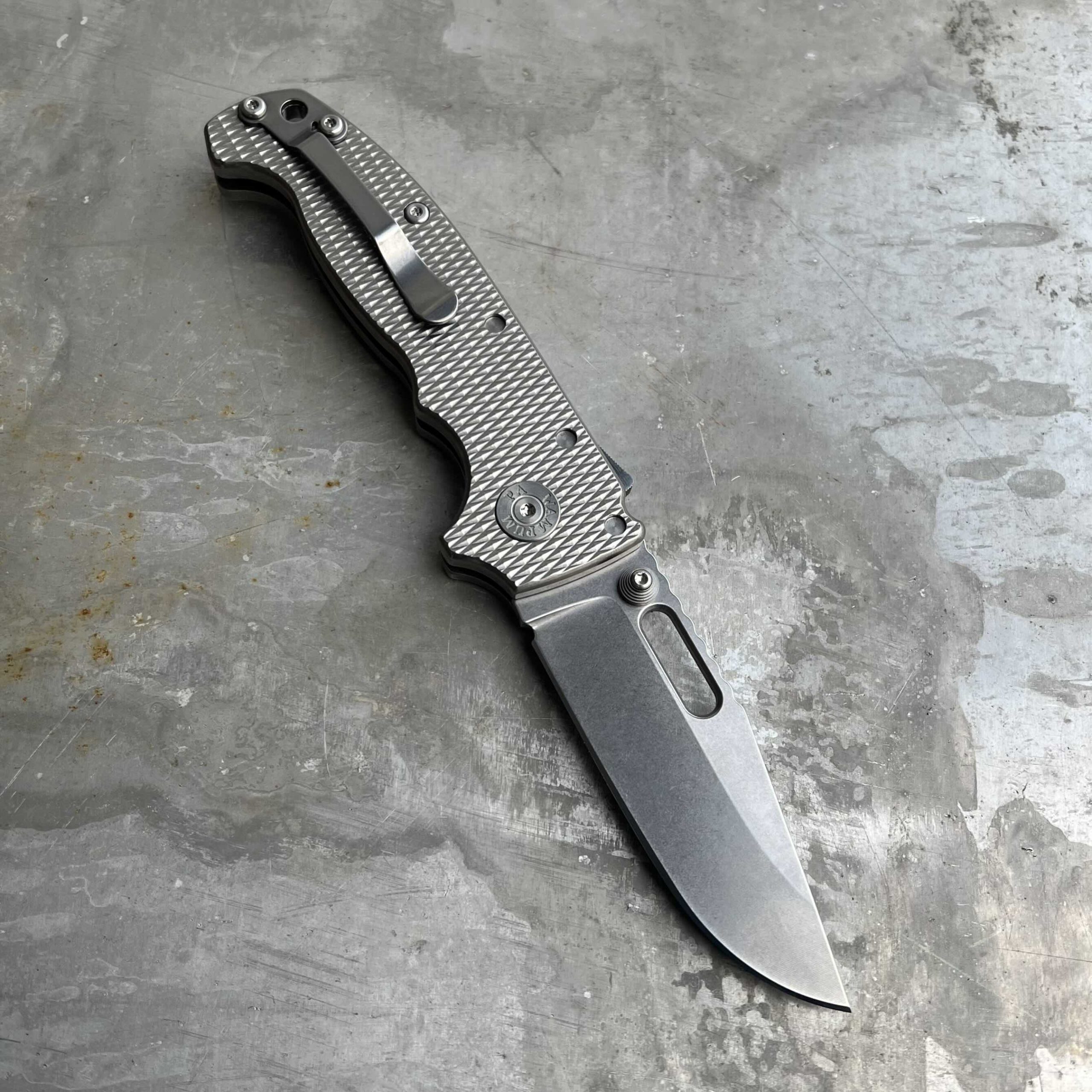 - Rękojeść: stalowe linersy, okładki z tytanu, stalowy klips mocujący (Tip-Up)