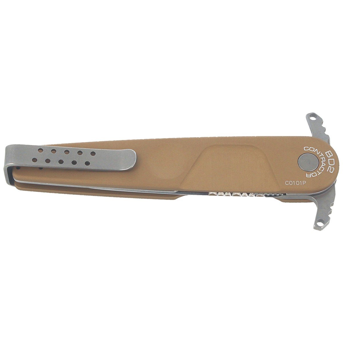 Rękojeść BD2 Contractor Desert posiada okładziny chwytu w kolorze piaskowym, wykonane z anodyzowanego aluminium. Dzięki temu jest lekka, ale jednocześnie wytrzymała. Otwarta budowa rękojeści, tzw. open-backed, ułatwia czyszczenie i konserwację. Projekt rękojeści uwzględniał potencjalne zastosowania noża w obronie osobistej, dlatego każda okładzina zawiera pojedynczy zagłębiony element (divot), który umożliwia obrót podczas zmiany uchwytu. Metalowy klips w kształcie mostka (bridge shaped clip) jest przekładany, umożliwia przenoszenie noża w pozycji tip-up (czubkiem do góry) w lewej lub prawej kieszeni. Stanowi również wygodne podparcie dla kciuka, co jest przydatne dla użytkowników ceniących odwrócony chwyt.