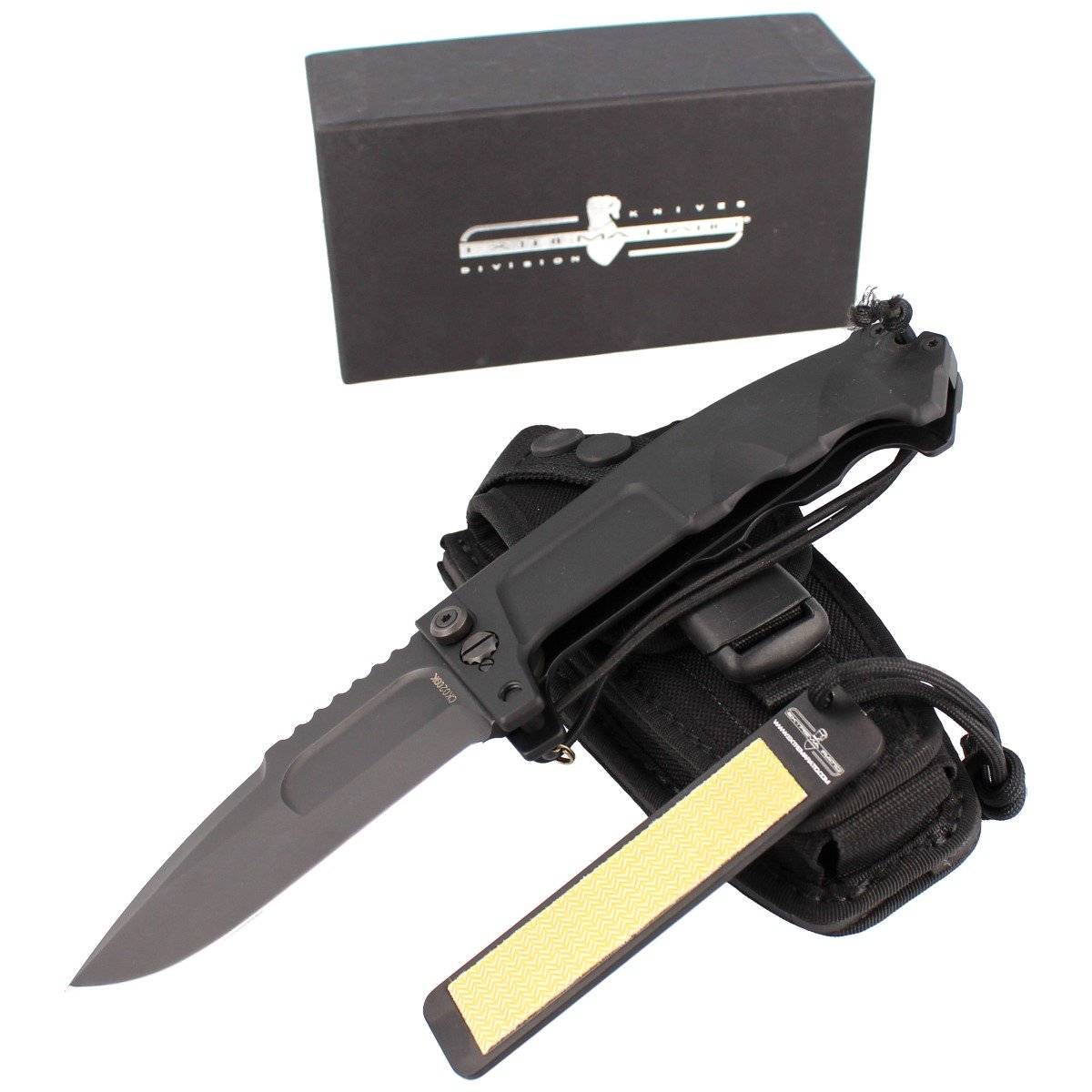 Pochwa – wielofunkcyjna z odpornego na przetarcia, wodoodpornego nylonu w kolorze czarnym. Zapinana klamrą typu DuraFlex. Kabura umożliwia przenoszenie złożonego foldera oraz z otwartym ostrzem jak noża ze stałą klingą na pasie lub na oporządzeniu / kamizelce za pomocą taśm systemu M.O.L.L.E. Dodatkowa kieszeń do przenoszenia diamentowej ostrzarki.