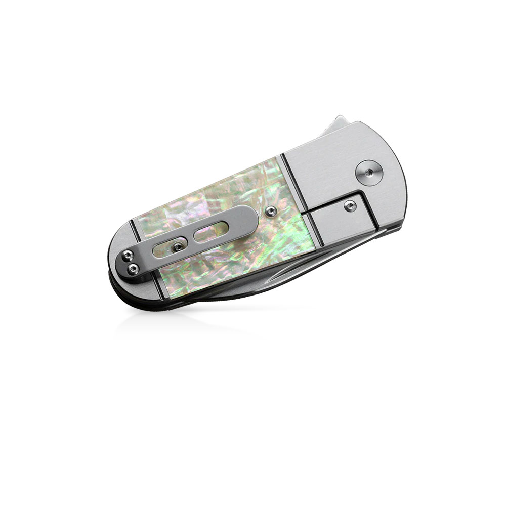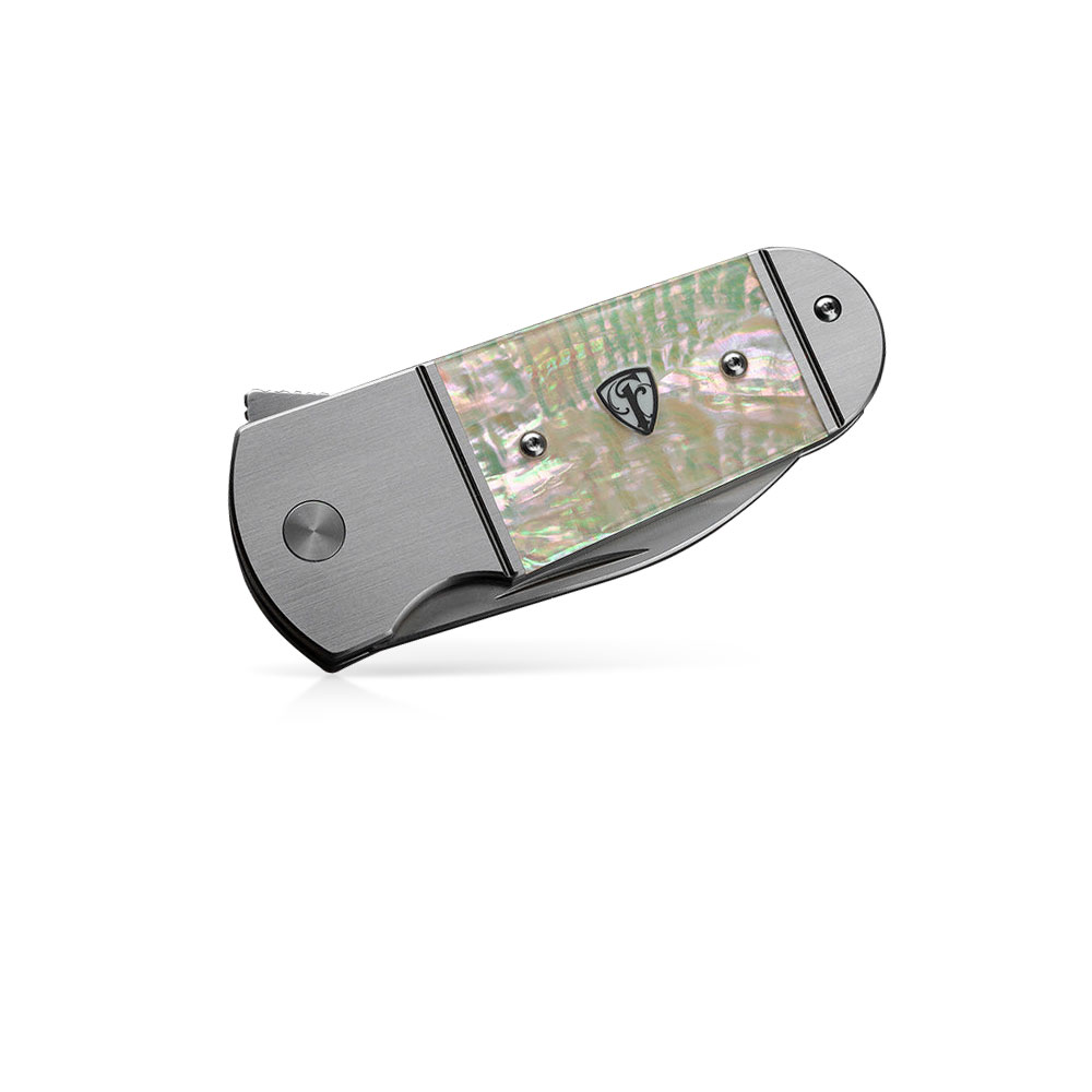 Rękojeść noża posiada tytanową konstrukcję. Część ramy tytanowej (bolster) jest zupełnie gładka, pośrodku natomiast została wyfrezowana w taki sposób by umieścić w niej wstawkę z masy perłowej, tworzącej wrażenie trójwymiarowości. Koniec rękojeści to znów tytan z brakiem teksturowania.