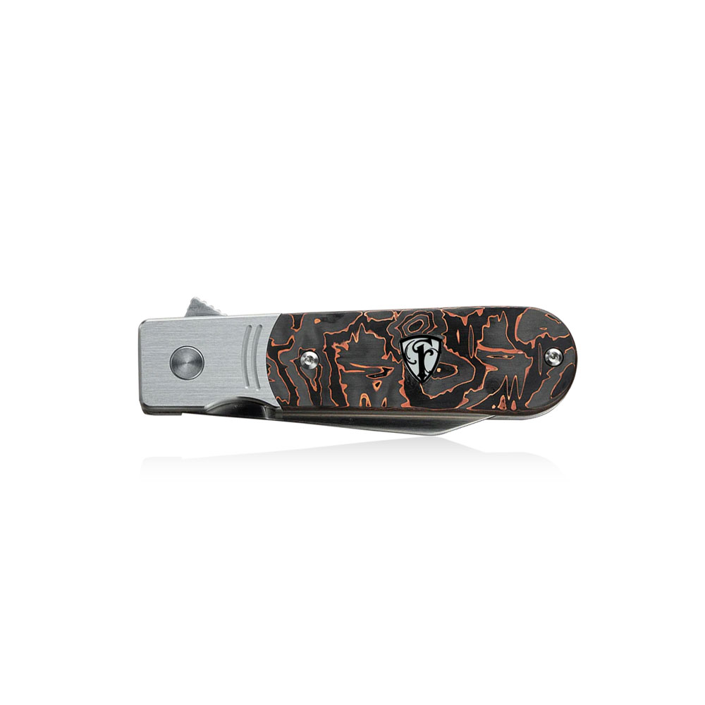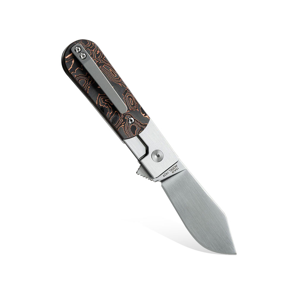 Nóż składany Finch Model 1929 Coppertone posiada wydajne ostrze typu clip point z amerykańskiej stali wysokiej jakości 154CM. Nóż posiada stalowy bolster i okładziny rękojeści z włókna węglowego przeplatanego w sposób nieregularny warstwami miedzi. W rękojeści znajdziemy fluroscencyjną wstawkę z logiem Finch. Otwieranie noża następuję za sprawą wystającej płetwy (flipper) a ostrze blokuje blokada typu frame lock. Nóż wyposażono w klips do przenoszenia z tytanu.