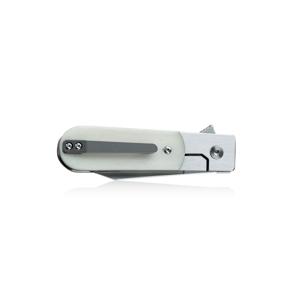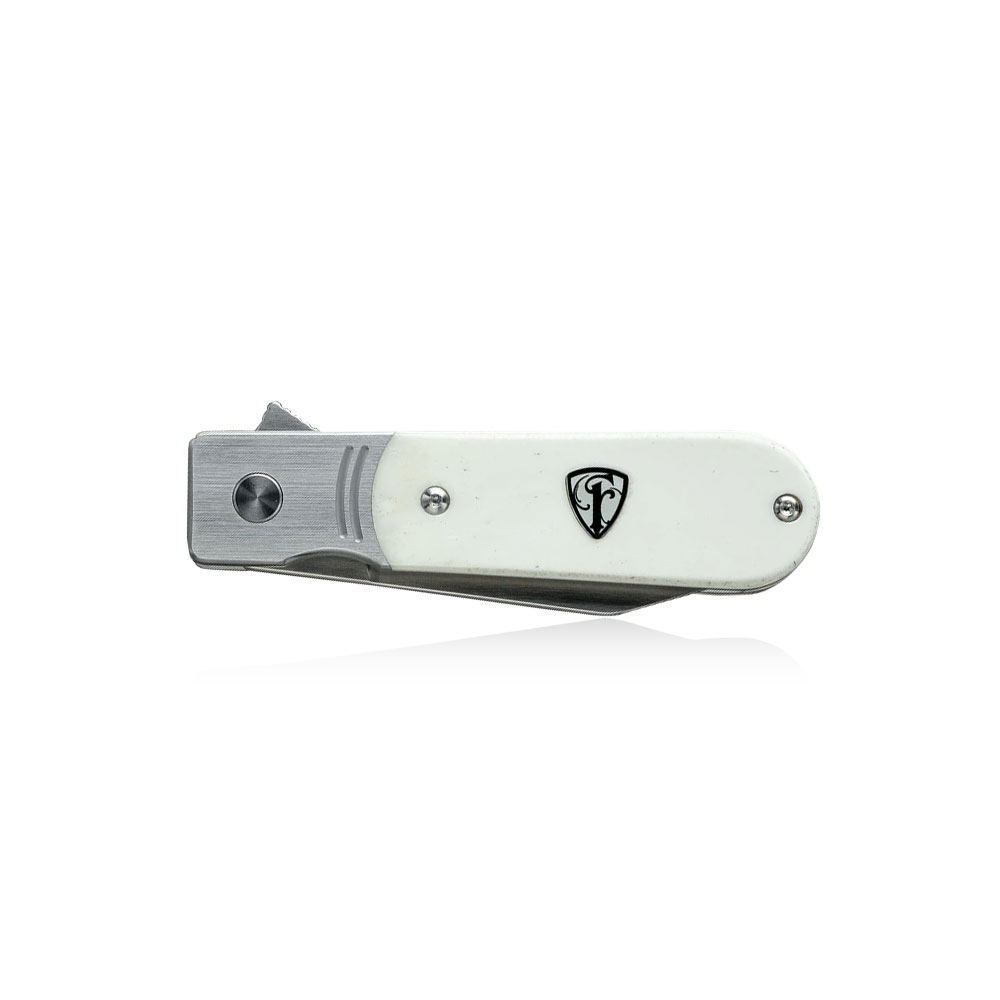Nóż posiada stalową konstrukcję (linersy oraz bolster), do której przytwierdzono okładziny rękojeści z utrwalonej kości (White Bone). Jest to materiał naturalny poddany chemicznemu utrwaleniu prezentujący się bardzo ekskluzywnie. Wyglądam przypomina masę perłową.