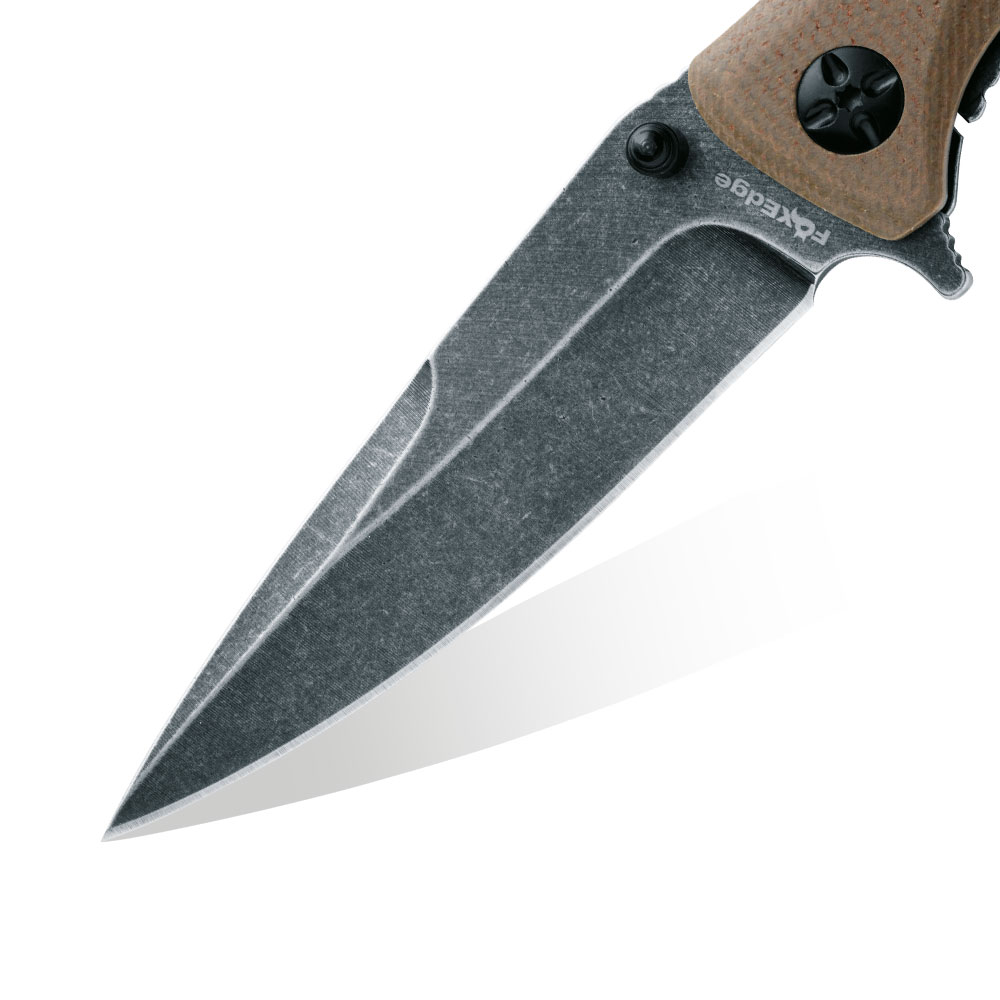 Nóż składany FOX Edge Mandatory Fun FE-025 Coyote Tan G10 by Russ Kommer posiada głownię ze stali nierdzewnej 8Cr13MoV (w powłoce stone washed PVD) oraz rękojeść ze stali i kompozytu G10 (kolor Coyote Tan). Ostrze noża otwieramy jedną ręką używając do tego obustronnego kołka na głowni lub flippera. Otwartą głownię przed zamknięciem zabezpiecza blokada frame lock. Nóż wyposażony został w stalowy klips mocujący.