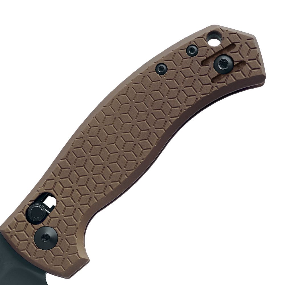 - Rękojeść: stalowe linersy, okładki z aluminium anodyzowanego na brązowo (brown anodized aluminium), aluminiowy backspacer anodyzowany na kolor czarny (black anodized aluminium), stalowy przekładalny klips mocujący, (black idroglider stainless steel, Tip-Up), śruby ze stali nierdzewnej (stainless steel screws)