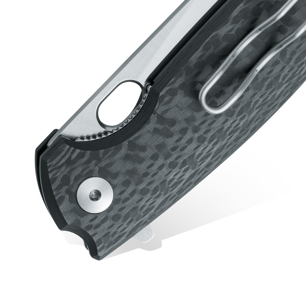 Klips mocujący w stylu Tip-Up i Deep Carry zlokalizowany na zakończeniu rękojeści noża umożliwia przenoszenie zamkniętego ostrza wierzchołkiem do góry oraz dyskretne przenoszenie całości w kieszeni. Klips wykonany został z drutu ze stali nierdzewnej (bead blasted AISI 302 Stainless Steel). Klips pasuje świetnie do koncepcji ultralekkiego foldera (całość wazy tylko 80 gram).